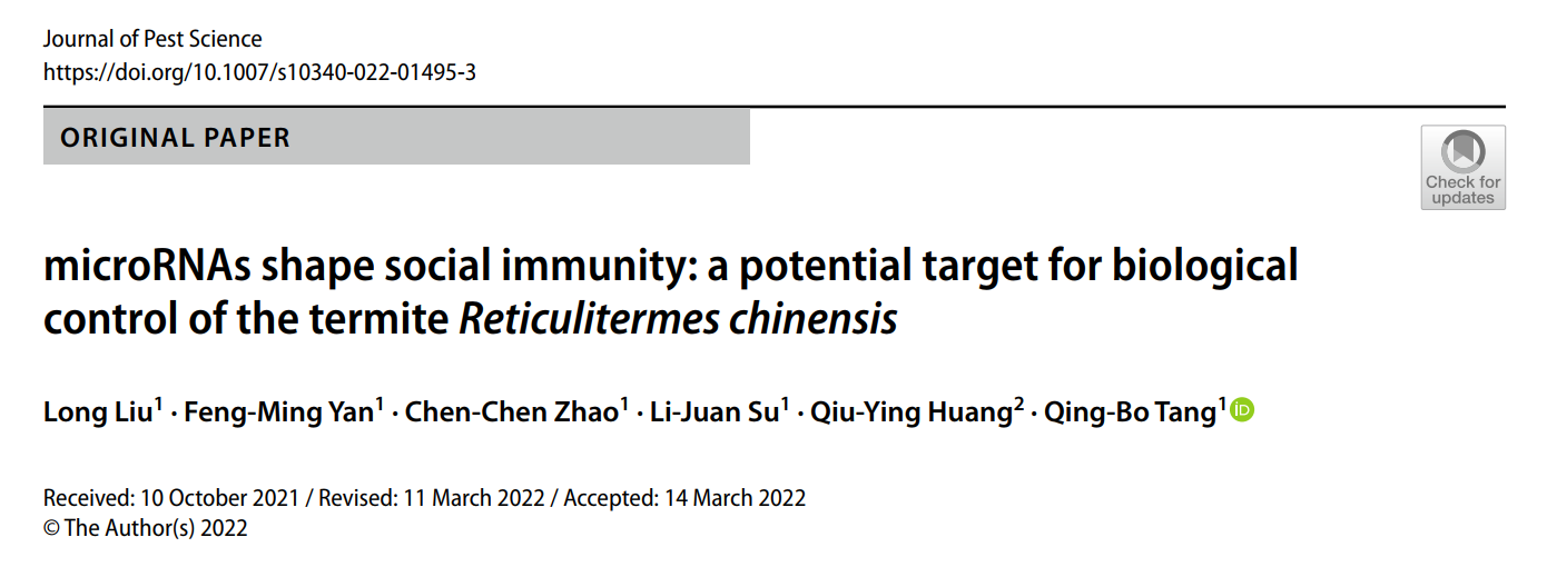 闫凤鸣教授团队在昆虫学知名期刊Journal of Pest Science(IF5 year=5.955,1区top期刊)上发表题为“microRNAs shape social immunity: a potential target for biological control of the termite Reticulitermes chinensis”的研究性论文,该研究发现microRNAs紊乱可以显著削弱社会性昆虫免疫力,从而提高有害昆虫对昆虫致病真菌的敏感度,提高感染死亡率,因此可作为防治社会性有害昆虫的一种新的分子靶标。