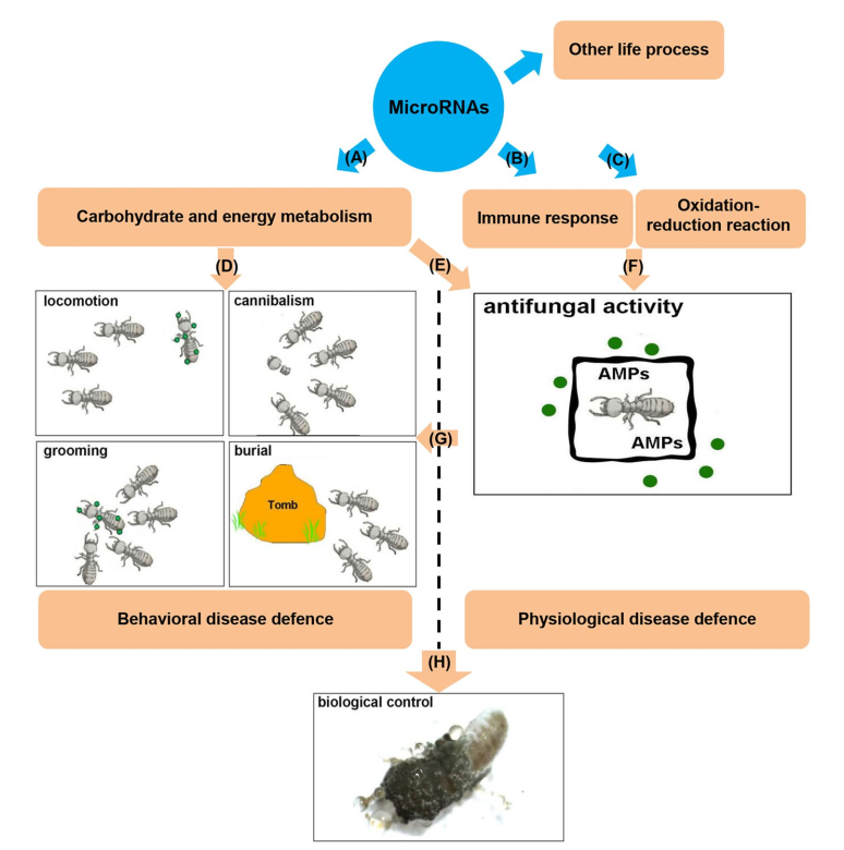 .该研究发现microRNA能够通过调控白蚁糖酵解、TCA循环等相关基因的表达影响白蚁行为免疫,例如迁移行为、理毛行为、嗜食同类和埋葬尸体;通过调控白蚁防卫素反应、抗氧化还原反应等相关基因的表达影响白蚁生理免疫,例如抗菌活性;此外还影响白蚁嗅觉、唾液分泌、表皮合成、解毒作用等相关基因的表达。因此,通过喂食白蚁microRNA模拟物(一种双链小分子RNA)可以显著提高染菌白蚁群体的死亡率。该结果为研发绿色害虫防治提供了新思路:通过靶标microRNA削弱白蚁社会免疫力,从而提高白蚁巢群的敏感度,提高生防菌(例如绿僵菌、白僵菌等)对白蚁巢群的防治效果。