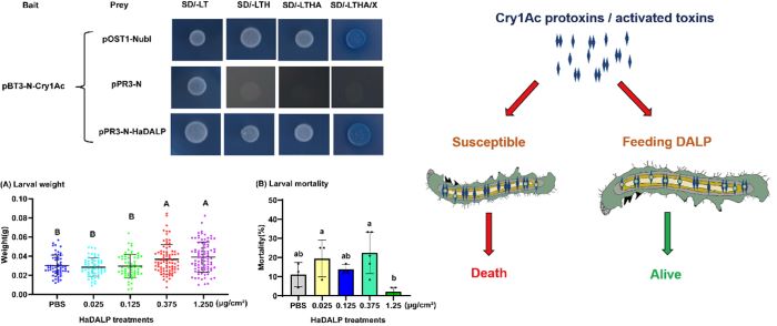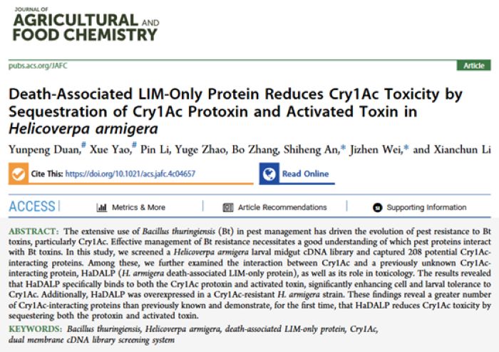 一区TOP期刊《Journal of Agricultural and Food Chemistry》杂志在线发表了题为“Death-associated LIM-only protein reduces Cry1Ac toxicity by sequestration of Cry1Ac protoxin and activated toxin in Helicoverpa armigera”的研究论文。研究发现了更多的与Cry1Ac结合的蛋白,并首次证明HaDALP通过结合Cry1Ac隔离原蛋白和活化毒素来降低Cry1Ac的毒性。