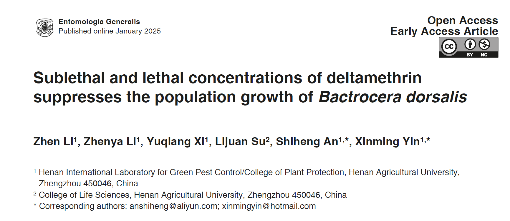 一区《Entomologia Generalis》杂志在线发表了题为“Sublethal and lethal concentrations of deltamethrin suppresses the population growth of Bactrocera dorsalis”的研究论文。研究揭示了亚致死和致死浓度的溴氰菊酯抑制桔小实蝇种群发生的机制。