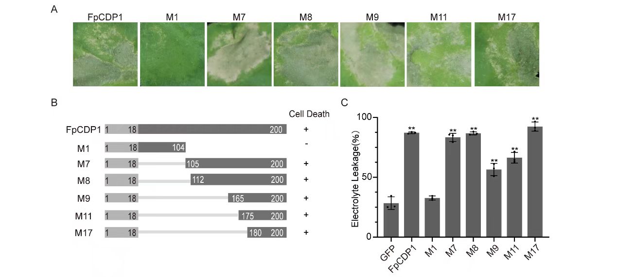 图1 假禾谷镰孢效应子FpCDP1能诱导烟草和番茄细胞坏死