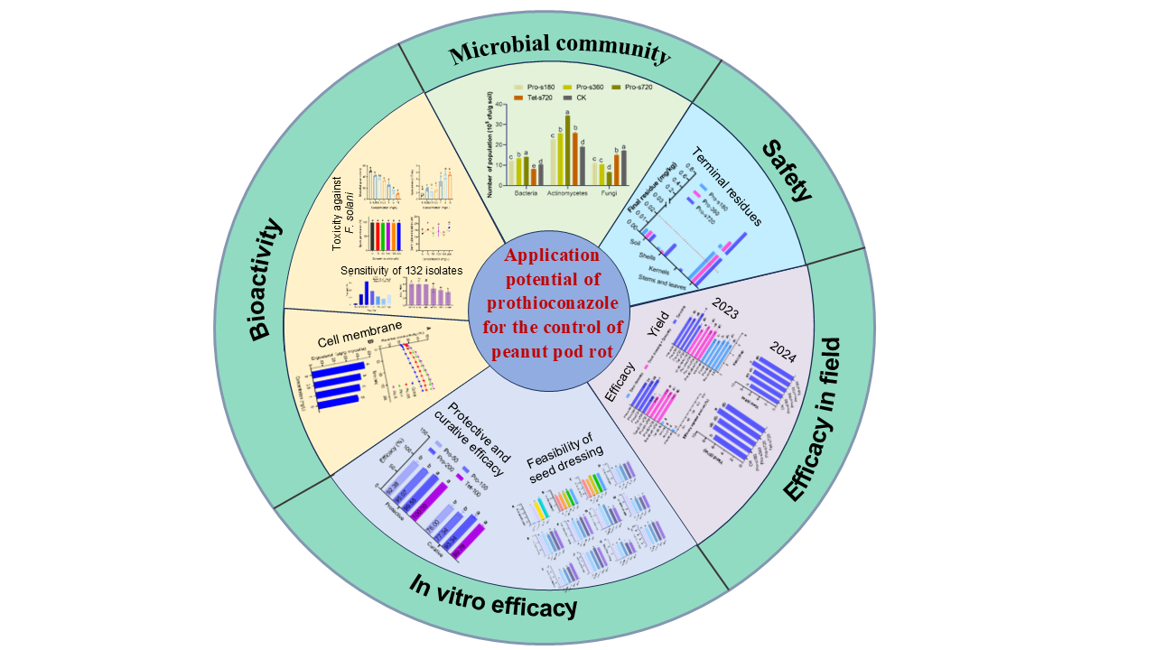 一区TOP期刊《Pest Management Science》发表了题为“Efficacy, food safety and microbial modulation of prothioconazole in the control of peanut pod rot”的研究论文。该研究系统评估了杀菌剂丙硫菌唑防治花生果腐病的最佳施药方式,证实丙硫菌唑防治花生果腐病具有“一箭三雕”(高效、安全、增产)作用,实现病害高效防控的同时保障食品安全,为花生产业可持续发展提供了重要技术支撑。