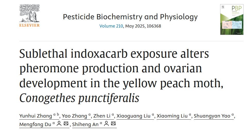一区TOP期刊《Pesticide Biochemistry and Physiology》发表了题为“Sublethal indoxacarb exposure alters pheromone production and ovarian development in the yellow peach moth, Conogethes punctiferalis”的研究论文,研究揭示了亚致死浓度的茚虫威抑制桃蛀螟性信息素生物合成与卵巢发育的机制。