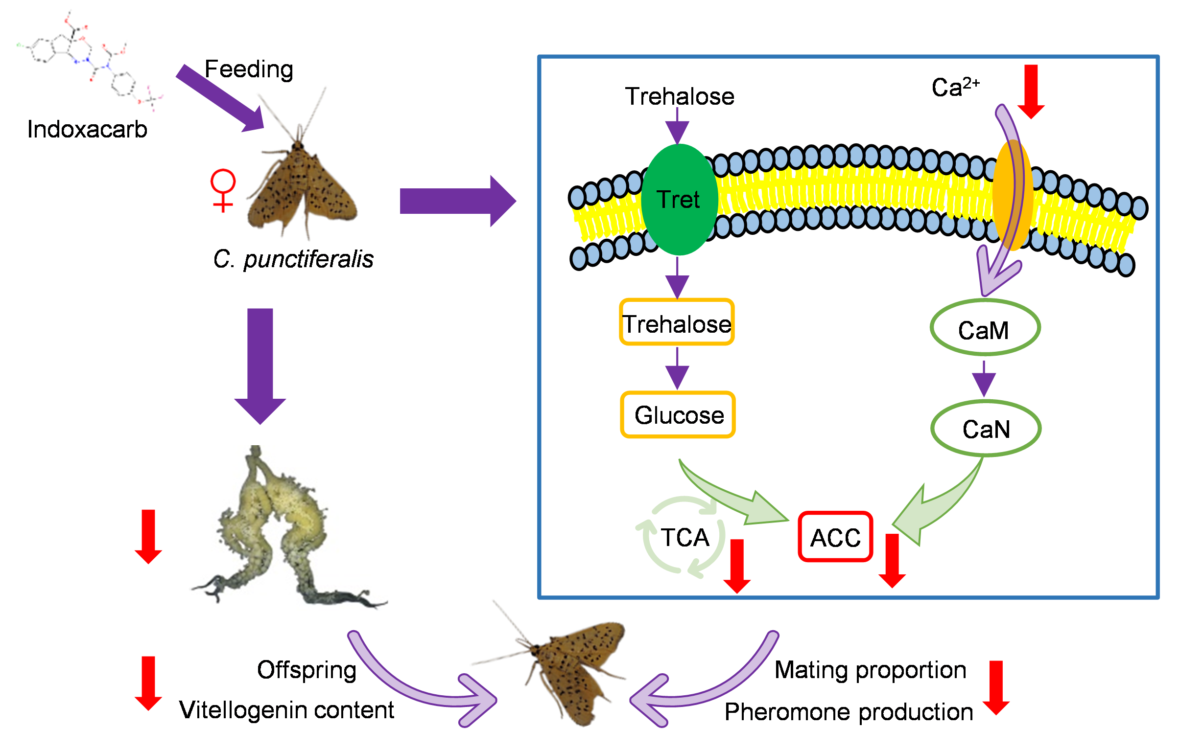 桃蛀螟(Conogethes punctiferalis)做为一种钻蛀性害虫,对桃树及其他果树造成严重的经济损失。茚虫威做为一种鳞翅目常用杀虫剂,在害虫防治中至关重要,本研究主要集中探讨了茚虫威对桃蛀螟成虫的潜在作用。研究表明,亚致死浓度茚虫威暴露可显著抑制雌蛾性信息素释放、降低雌虫对雄虫的吸引力并导致交配成功率显著下降。进一步研究发现,亚致死浓度茚虫威暴露导致信息素腺体(Pheromone gland, PG)内钙离子(Ca2+)水平显著降低,继而影响乙酰辅酶A羧化酶(Acetyl-CoA carboxylase, ACC)活性及性信息素合成相关基因表达水平。生理生化实验显示,茚虫威暴露显著降低PG中海藻糖含量、己糖激酶活性及丙酮酸含量。此外,亚致死浓度茚虫威的暴露可抑制桃蛀螟卵巢体积和降低卵黄蛋白原(Vitellogenin, Vg)含量,进而阻碍卵巢发育。转录组分析显示,与卵巢发育相关的卵黄蛋白原、卵黄蛋白原受体(Vitellogenin receptor, VgR)及脂质代谢相关基因表达发生显著变化。本研究首次揭示茚虫威对桃蛀螟成虫具有双重调控效应,既可抑制性信息素生物合成又可阻碍卵巢发育。研究结果为阐明亚致死剂量杀虫剂暴露影响鳞翅目成虫生理的机制提供了新的理论依据。