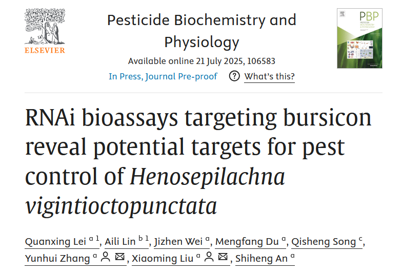 一区TOP期刊《Pesticide Biochemistry and Physiology》发表了题为“RNAi bioassays targeting bursicon reveal potential targets for pest control of Henosepilachna vigintioctopunctata”的研究论文,研究揭示茄二十八星瓢虫发育关键基因,为RNA干扰新型生物农药开发提供靶点。