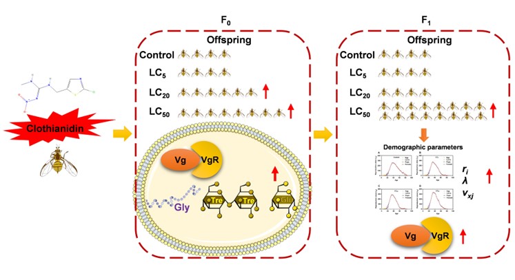 本研究以新烟碱类杀虫剂噻虫胺为研究对象,系统评估了其对入侵害虫桔小实蝇(Bactrocera dorsalis)的繁殖、生理代谢及种群动态的影响。结果发现,在亚致死和致死浓度(LC20和LC50)处理下,F0代雌虫的繁殖能力显著增强,这种促进效应在F1代中依然延续,尤其在LC50处理组最为明显。进一步的生理分析表明,噻虫胺处理显著改变了桔小实蝇的脂质和糖类代谢,导致糖原和葡萄糖水平升高,从而为繁殖提供了更多能量支持。同时,处理后其体内保幼激素(JH)和蜕皮激素(20E)水平升高,并伴随卵黄蛋白(Vg)及其受体(VgR)的含量和基因表达水平的上调,这些变化均与繁殖能力增强密切相关。桔小实蝇F1代的种群生命参数发生显著变化,其雌成虫年龄-特征繁殖力(fx)、年龄-阶段特征繁殖值(vxj)、内禀增长率(r)、周限增长率(λ)以及净繁殖率(R0)均明显上升,而平均世代时间(T)缩短,种群整体增长速度加快。该研究结果表明,尽管噻虫胺对桔小实蝇有较好的防治效果,但其亚致死效应可能在一定条件下加速害虫种群恢复,有引起种群二次暴发的风险。本研究为理解害虫对杀虫剂的生理适应机制提供了重要科学依据,同时也提示在使用化学农药时需谨慎,避免因不当使用导致害虫再猖獗。