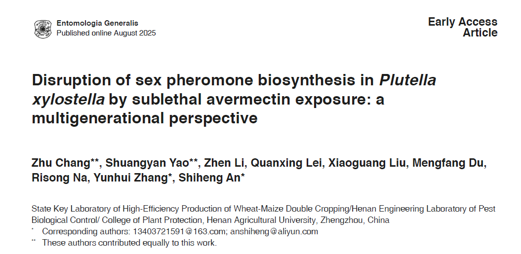 安世恒教授课题组在中科院一区TOP期刊《Entomologia Generalis》发表了题为“Disruption of sex pheromone biosynthesis in Plutella xylostella by sublethal avermectin exposure: a multigenerational perspective”的研究论文,该研究系统揭示了小菜蛾性信息生物合成的信号转导机制以及阐明了化学农药阿维菌素阻扰性信息素合成以及繁殖的机理。