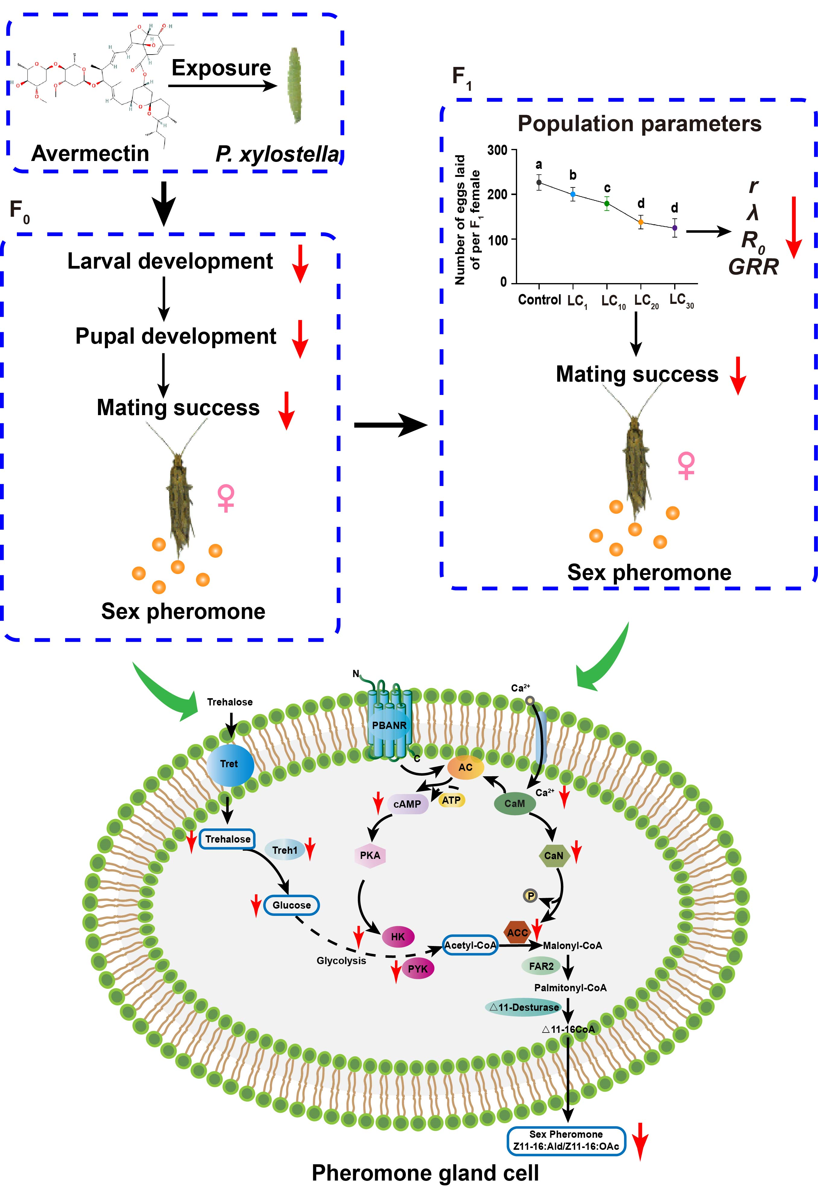 本研究聚焦于调控性信息素合成的神经肽——信息素生物合成激活神经肽(PBAN)及其下游信号通路,通过小菜蛾性信息素腺体转录组的鉴定,系统揭示了PBAN受体(PBANR)、钙调磷酸酶(CaN)和乙酰辅酶A羧化酶(ACC)等关键基因在小菜蛾性信息素合成过程中以及对其交配反应的调控作用。这一发现不仅揭示了小菜蛾性信息素合成的分子机制,也为精准干扰害虫交配行为提供了潜在靶点。在此基础上,团队进一步探讨了阿维菌素的亚致死剂量对小菜蛾性信息素合成与交配行为的影响。结果发现,阿维菌素能够显著抑制信息素合成,其机制可能与钙离子内流减少及合成酶活性下调有关。值得关注的是,这种干扰效应还会延续至下一代,表现出明显的跨代效应。该研究不仅深化了对小菜蛾性信息素生物合成机制的认识,也展示了低剂量农药通过行为干扰途径进行害虫控制的潜力,为未来绿色、高效、可持续的农业病虫害防控技术开辟了新思路。