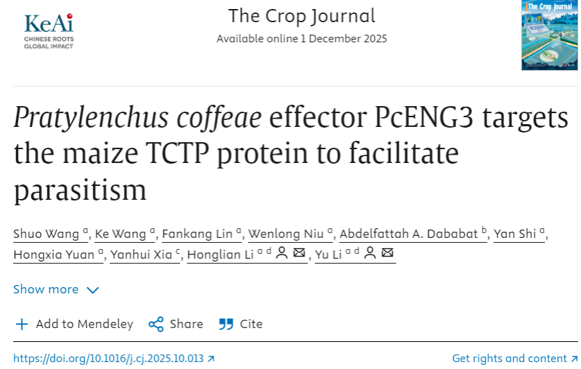 一区TOP期刊《The Crop Journal》发表了题为“Pratylenchus coffeae effector PcENG3 targets the maize TCTP protein to facilitate parasitism”的研究论文。该研究解析了咖啡短体线虫效应蛋白PcENG3直接靶向玉米肿瘤翻译控制蛋白ZmTCTP2a,抑制寄主抗病性并调控玉米根系细胞增殖分化和生长发育,通过“抗病抑制+组织重塑”双重策略促进线虫侵染寄生的分子机制。