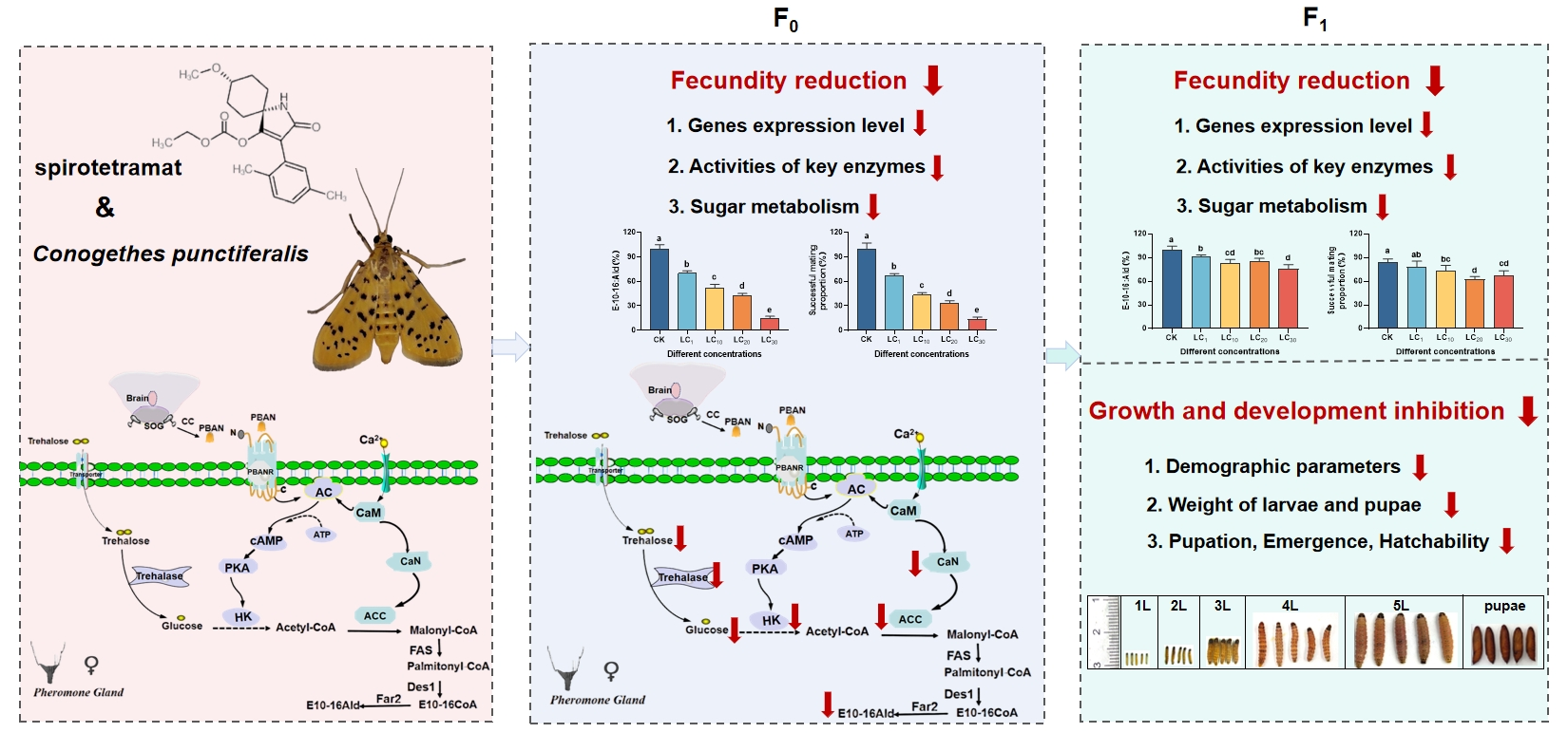 研究团队通过系统实验发现,螺虫乙酯在亚致死浓度下即可显著抑制桃蛀螟雌蛾性信息素的合成,导致其吸引雄蛾的能力下降,交配率大幅降低。进一步机制研究表明,该药剂通过抑制ACC活性,干扰了PBAN/Ca²⁺/CaN/ACC信号通路,同时影响性信息素的“原料”-糖类的代谢和稳态,从而阻断性信息素前体物质的生成。令人关注的是,这种效应具有显著的跨代持续作用。即使子代(F₁)未直接接触药剂,其幼虫发育仍受到抑制,体重减轻、化蛹率和羽化率下降,并且性信息素合成能力也显著减弱。通过构建生命表进行分析,研究人员发现子代种群的内禀增长率(r)和净生殖率(R₀)均显著降低,种群倍增时间延长,表明螺虫乙酯可通过“生殖干扰”实现长期种群压制。