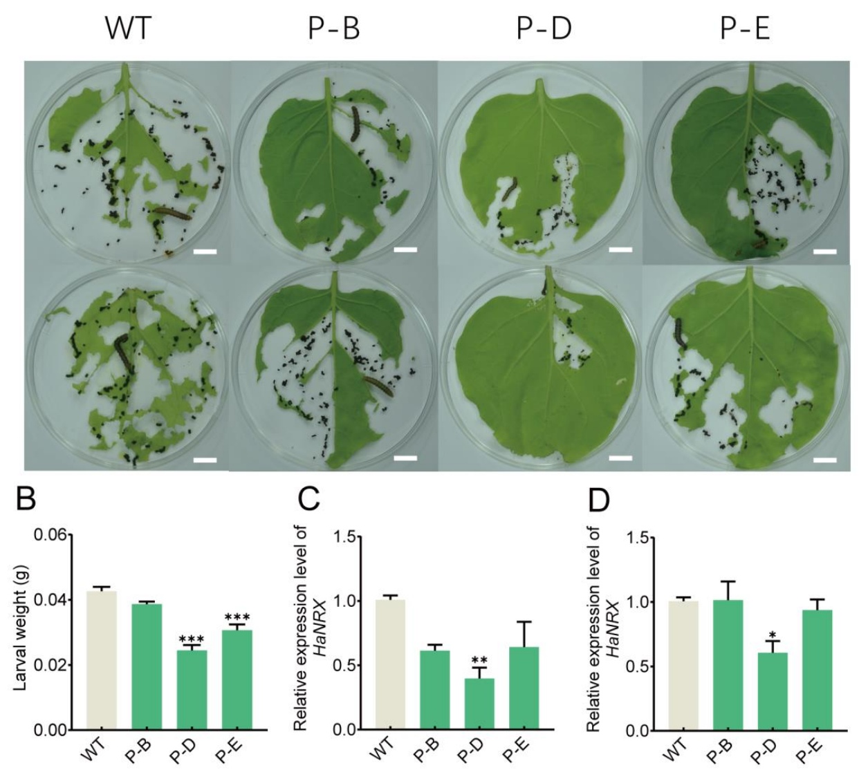 该研究证实,NRX基因在鳞翅目昆虫中高度保守,针对该基因的dsRNA对棉铃虫和草地贪夜蛾均表现出良好防治效果,凸显其作为广谱RNAi靶标的潜力。同时,利用转基因烟草递送dsHaNRX成功抑制害虫生长,验证了植物介导RNAi在害虫防控中的可行性。展望未来,可通过提高转基因作物中dsRNA的表达效率、优化dsRNA分子结构以增强稳定性、设计多靶点dsRNA以降低抗性风险,或结合RNAi与低毒化学农药、Bt毒素等策略实现协同防控,从而进一步提升RNAi技术在农业害虫治理中的应用效能。