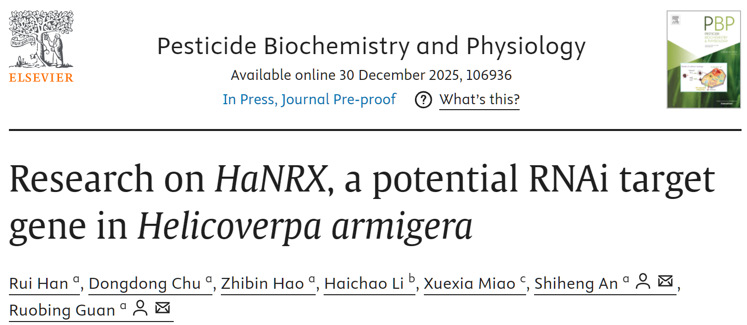 安世恒教授团队在《Pesticide Biochemistry and Physiology》发表了题为“Research on HaNRX, a potential RNAi target gene in Helicoverpa armigera”的研究论文。该研究揭示棉铃虫中HaNRX基因可作为RNA生物农药防治棉铃虫的高效潜在靶标,并系统评估了植物介导RNAi技术在害虫绿色可持续防控中的可行性与应用潜力。研究成果为棉铃虫绿色综合防控策略提供了新的理论与技术依据。