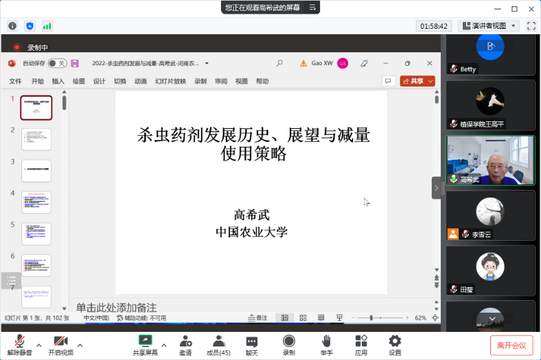 高希武以“杀虫药剂发展历史、展望与减量使用策略”为主题,从害虫化学防治历史事件入手,详细介绍了五代杀虫药剂的发展历程、纠正因环境问题而导致的人类对杀虫药剂的片面认知、探讨了杀虫药剂与可持续植物保护的兼容性、以及杀虫药剂未来发展的方向与趋势。高希武系统性分析了化学防治在有害生物综合治理中的定位,明确了化学防治药剂的不可替代性,并从我国农业害虫抗药性进化与现状出发,通过揭示害虫抗药性发展导致的风险,引发了大家对农药减量使用的思考。闫凤鸣、王高平分别就草地贪夜蛾抗药性基因的起源,以及农药减量的推广应用效果,与高希武进行了深入的交流。