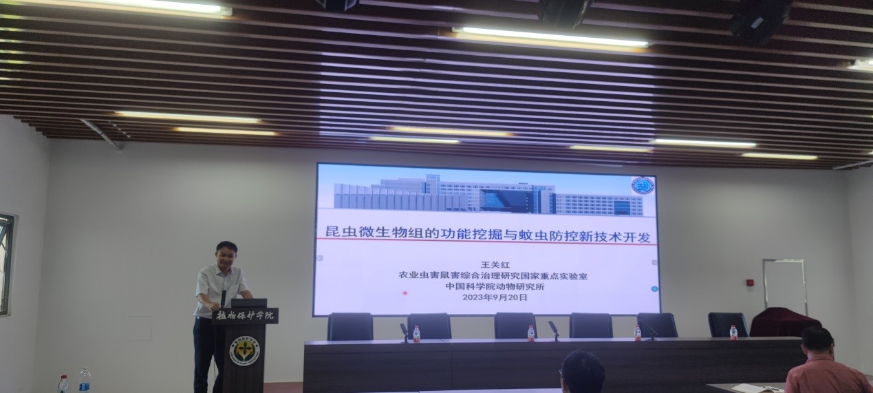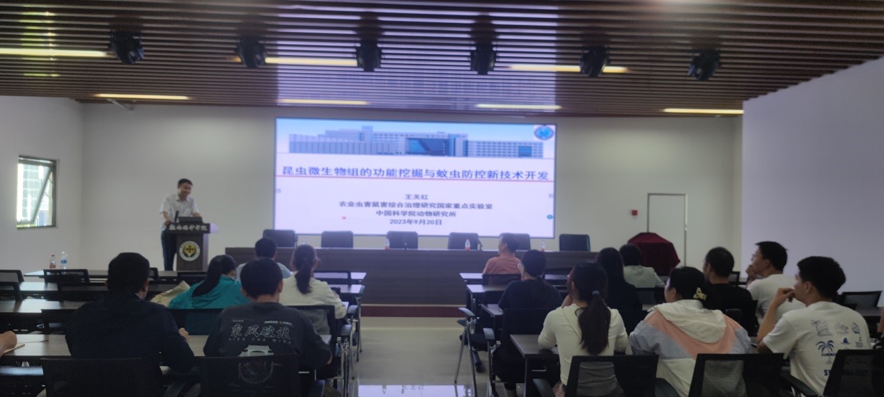 王关红研究员的报告题目为“昆虫微生物组的功能挖掘与蚊虫防控新技术开发”,王博士的研究报告大处着眼小处着手,从全球视野简要介绍了世界地球微生物计划、中科院微生物组计划等重大计划的研究内容和进展,进而强调了微生物研究的重要性,并提出全生物概念,即微生物和宿主形成联合体。以实验室模式动物金小蜂为研究对象,详细阐述了宿主-微生物系统关系一致,宿主微生物响应莠去津刺激,引起微生物分化,提高农药降解能力,增强宿主免疫能力和抗药性。长期的药物选择压力会诱导产生稳定的宿主微生物群落,而受选择的微生物会诱导宿主基因组分化,从而证明了宿主微生物基因组存在协同分化。基于该研究发现,王博士进而提出基于微生物的新型媒介蚊虫防控新理论,改变蚊虫微生物,诱导蚊虫性别转变,促使蚊虫性别比例失调,从而缩减蚊虫种群密度,达到蚊虫防控的目的。王博士报告结束后,与会师生就微生物在蚊虫防控,寄生蜂性别调控以及高等动物疾病预防和繁殖等方面的应用前景同王博士进行了热烈讨论。与会师生一致认为,王博士的报告内容精彩纷呈,王博士的研究成果顶天立地。研究水平高超,应用前景广阔,在蚊虫、传染病防控等方面都有重要的应用价值。