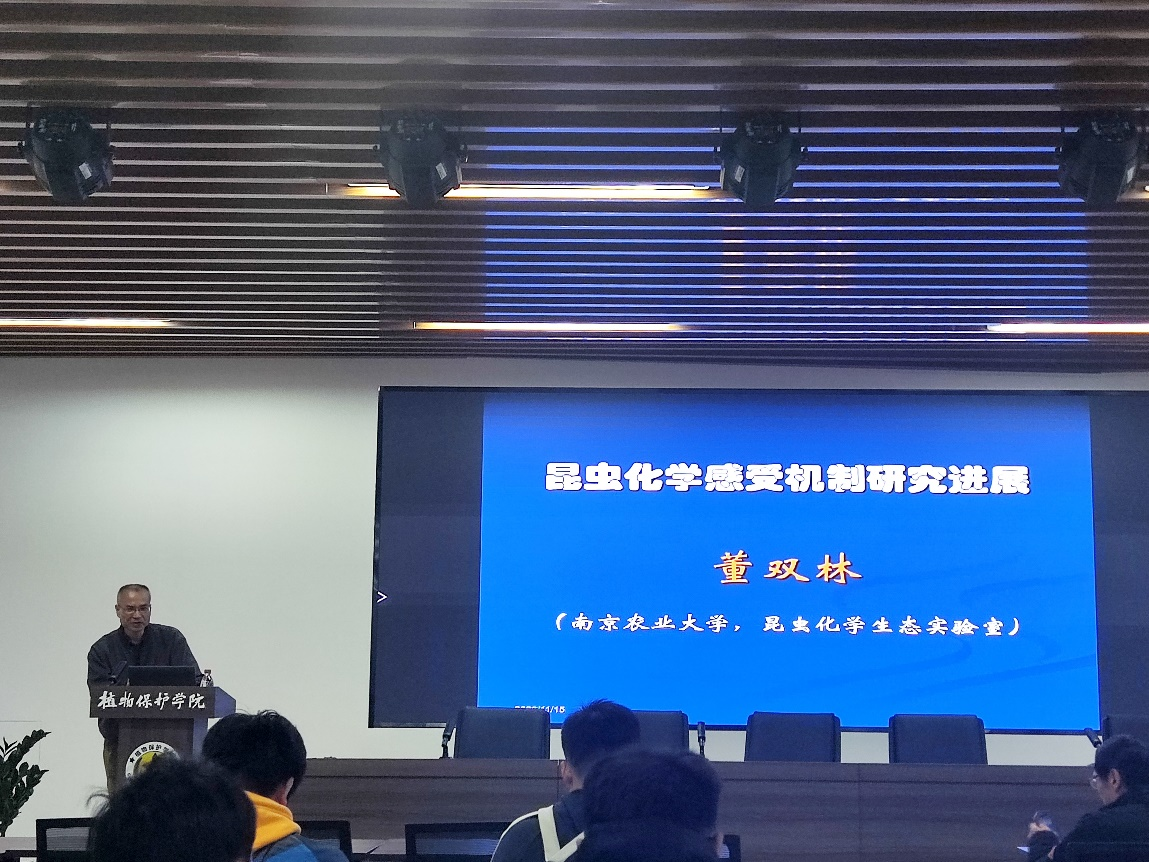 董双林教授的报告题目为“昆虫化学感受机制研究进展”,董教授首先为我们介绍了自己团队的研究方向和研究的主要内容,以植食性昆虫寄主选择的行为顺序,说明了昆虫的化感机制在昆虫生长发育过程中的重要作用,又为我们讲述了昆虫化感器官与化感器的类型,然后对昆虫化感机制做了详细的介绍,包括化感的基本过程、气味结合蛋白、气味受体等。最后为我们分享了目前昆虫化感研究的新进展。董教授的报告内容详细,生动形象,为我们呈现出了一幅完整的昆虫化学感受“画卷”,让与会师生感到耳目一新。