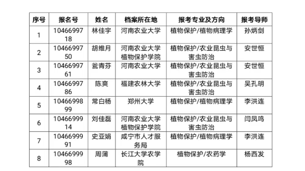 | 090400植物保护 | 6人 | 01植物病理学(2人) | 李洪连 | 申请考核 |