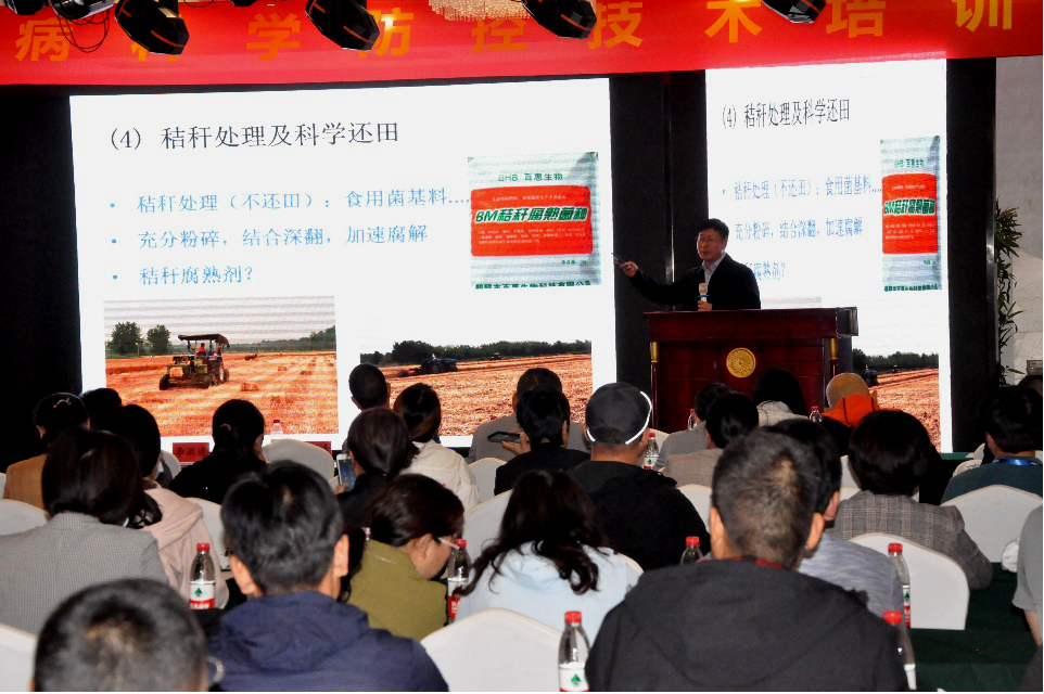 田间现场观摩结束后,李洪连教授在焦作市月季花园酒店会议室进行了小麦茎基腐病防控技术培训,受到与会人员广泛好评。自李洪连教授团队于2012年在国内首次报道小麦茎基腐病以来,他带领团队成员对该病害进行了系统深入研究,并取得了一系列的研究成果。同时,结合该病防控工作需要,项目组制订了《小麦茎基腐病综合防治技术》河南省地方标准,已于今年4月发布实施。