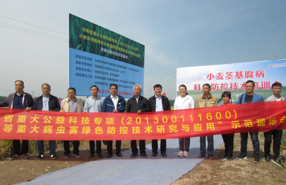 银河娱乐场 院长、河南省重大公益性科研专项“小麦条锈病等重大病虫害绿色防控技术研究与应用”(201300111600)项目主持人李洪连教授在现场向与会人员介绍了我国小麦茎基腐病的发生为害情况、项目主要研究进展、田间试验安排、试验和示范田不同处理的防治效果,通过抗病品种结合药剂种子处理等措施,能够有效地控制小麦茎基腐病的发生为害,防病增产效果十分显著。观摩过程中李洪连教授与有关领导、专家及与会人员进行了深入的讨论交流。与会领导和专家对该项目取得的成果给予了高度的评价和充分的肯定,同时也对项目组的下一阶段工作提出了具体要求和指导性意见。