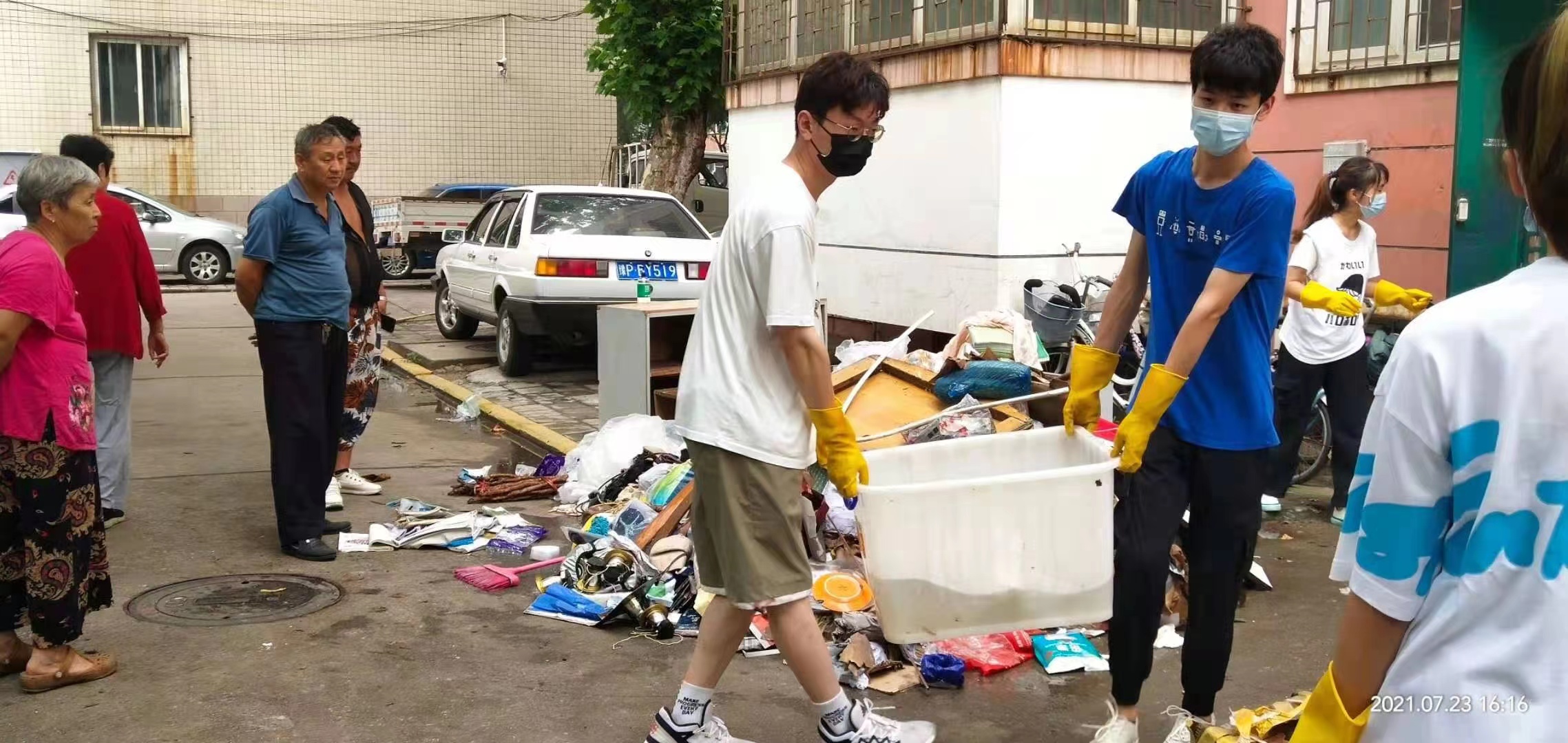 学生成立青年防汛志愿服务队在一区家属院地下室开展志愿服务活动。