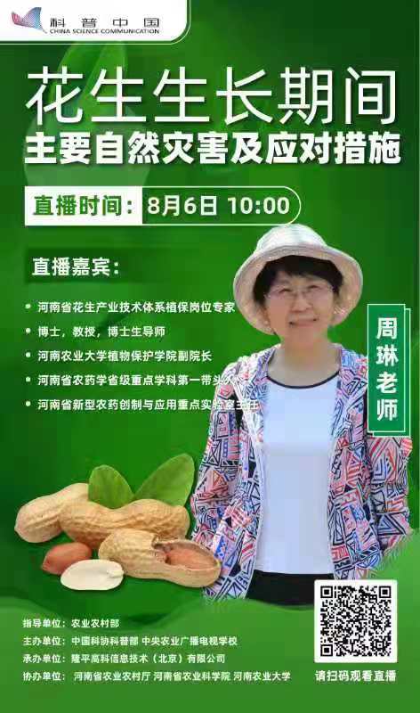 本网讯(通讯员 鲁兴)8月6日上午,河南省花生产业技术体系植物保护岗位专家、银河娱乐场 周琳教授以"花生生长期主要自然灾害及应对措施"为主题,针对花生易遭受的涝灾、旱灾等气象灾害和病虫等生物灾害,从发生时期、症状表现、防控原理及具体应急措施等方面,在"科普中国"App上进行了线上直播培训,受益群众近万人次,理论深入浅出,技术实用可行,深受广大听众的好评和点赞!