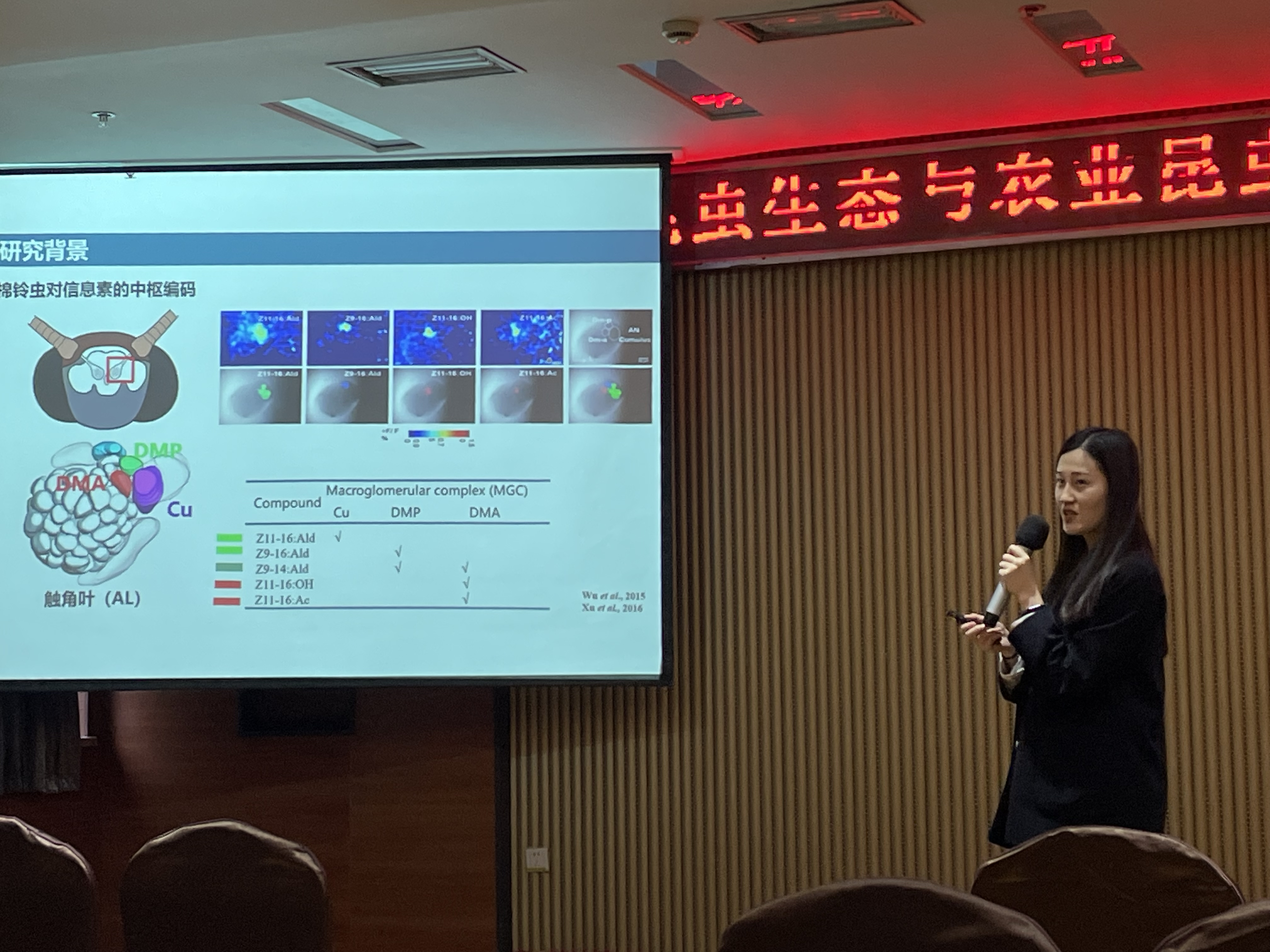 本次会议共设9个分会场。昆虫学系3名教师,2名研究生做了报告,闫凤鸣教授做了题为“植物-介体-病毒互作的化学生态学”的报告,魏纪珍副教授报告题目为“CAN在棉铃虫抵御Bt毒杀中的功能解析”,赵晨晨博士做了报告“共生菌介入下烟粉虱传CCYV能力变异机制”;博士研究生刘晓岚和孙龙龙分别做了“棉铃虫幼虫颚神经节的结构与神经元鉴定”和“雄性棉铃虫编码性信息素的神经通路”的报告。