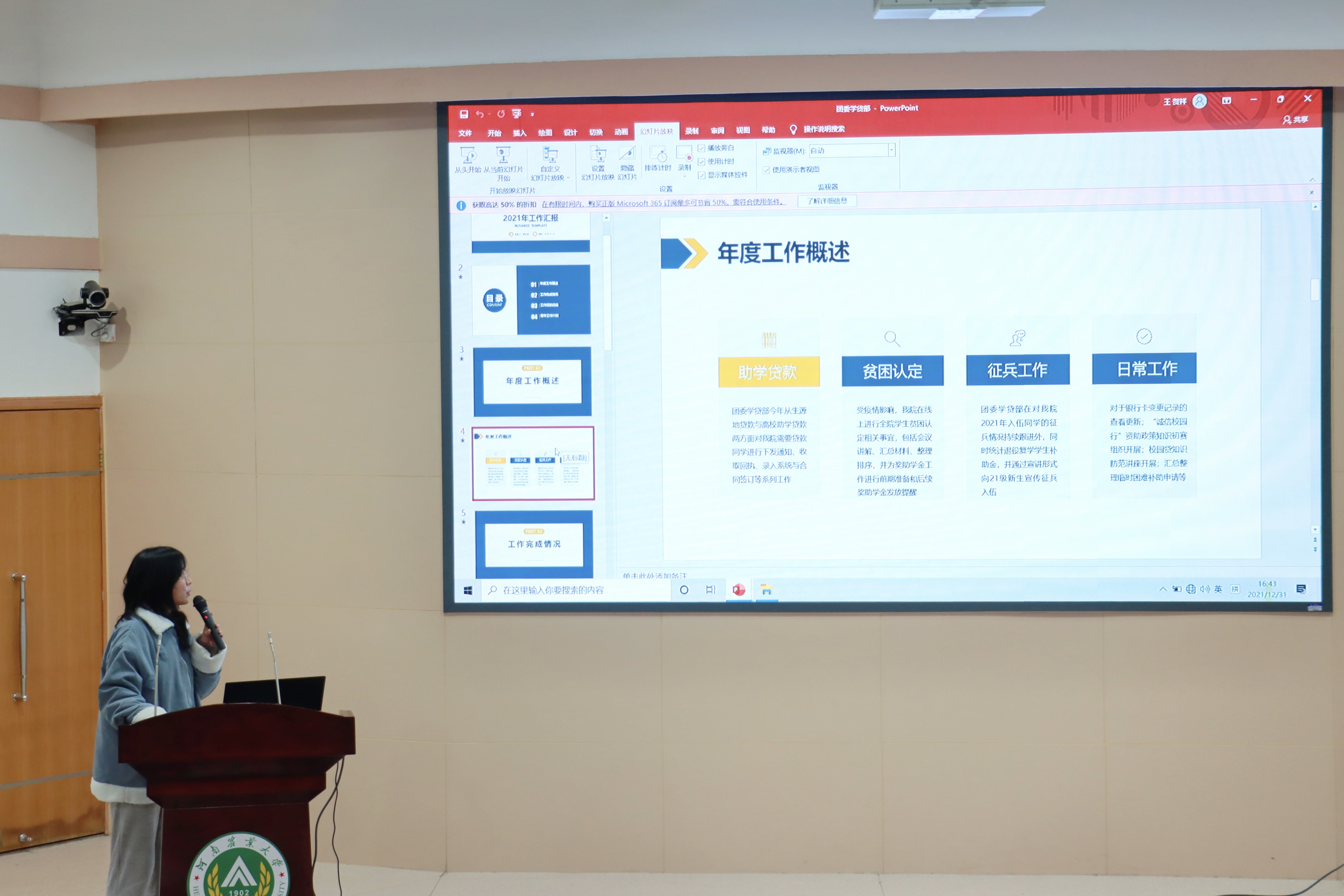 此次期末总结大会由郑旗星主持,各部门负责人进行工作总结汇报,报告顺序依次为研究生会,学生会、党建、团委、青语宣传媒体中心。部门负责人从部门简介、工作内容、工作成就、工作经验、明年的工作计划等方面进行了概述。部门负责人反思了工作中的问题,也向学生干部们传授了经验。各部门负责人汇报完毕后,两位学生干部上台发表自己在任职期间的感受和自己对于学生干部这一职位的认识,以及对未来的发展期望。其中学生干部张峻权简述了自己对于宣传工作重要性的认识,并且十分认同银河娱乐场 微信推文的审核机制。甄珍做最后的总结发言,对本学年的学生工作进行了肯定并对学生干部提出了三点要求:一、准确定位,明确职责;二、严于律己,树立榜样形象;三、团结协作,互相学习,期望干部们可以珍惜宝贵机会、强化自我担当、练就金钢铁骨。
