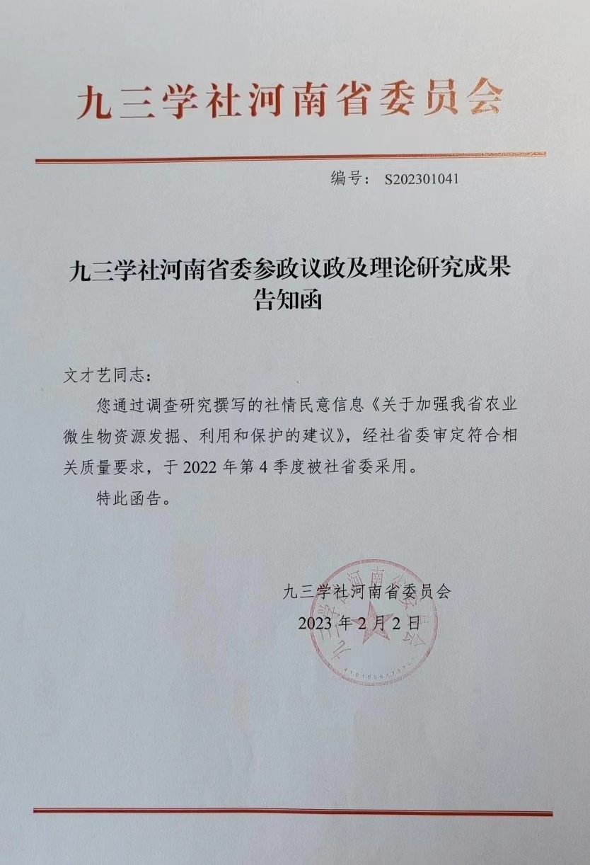 文才艺为银河娱乐场 植物病理学系教授、博士研究生导师,第四批“智汇郑州•1125聚才计划”创新领军人才,现任九三学社河南省委常委、银河娱乐场 委员会主委。主要从事植物病害生物防治、农业微生物资源发掘与利用等方面的教学和科研工作,在立足本职工作的同时,充分发挥专业优势,积极开展社会服务。文才艺热爱多党合作事业,时刻不忘合作初心,自觉践行社会主义核心价值观,为银河娱乐场 和学科的高质量发展凝聚共识、建言献策,先后获得九三学社中央“全国优秀社员”、“社会服务先进个人”等荣誉称号。