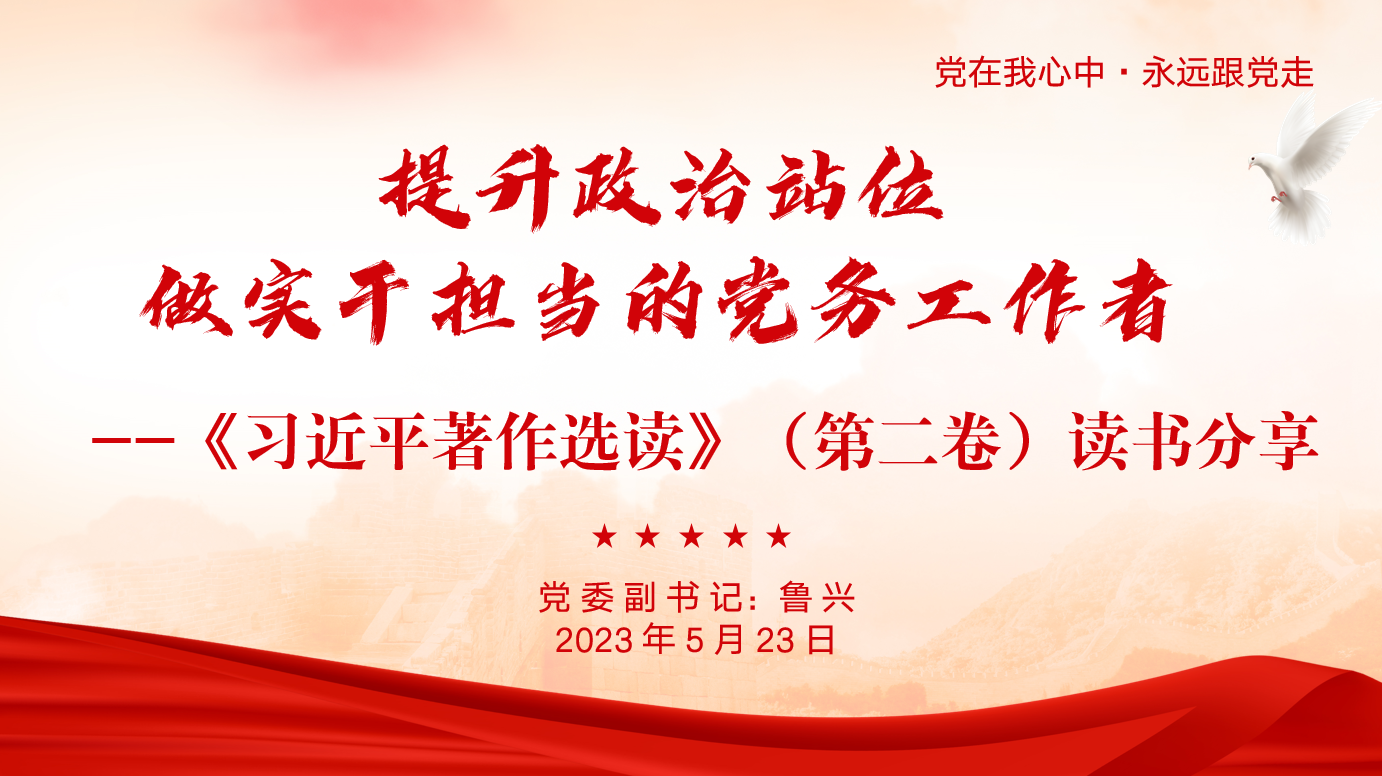 鲁兴和大家分享了《习近平著作选读》(第二卷)读书感悟。作为一名党务工作者,一是提升政治站位,强化学习的意识,保持谦虚谨慎的态度,对标优秀,悟思想,转作风,提能力;二是学思践悟担当作为,俯下身子,精益求精,在工作实践中完善、提升自己;三是理清现阶段的工作思路,做好重点难点工作,真正实现一个支部就是一个堡垒,一名党员就是一面旗帜。