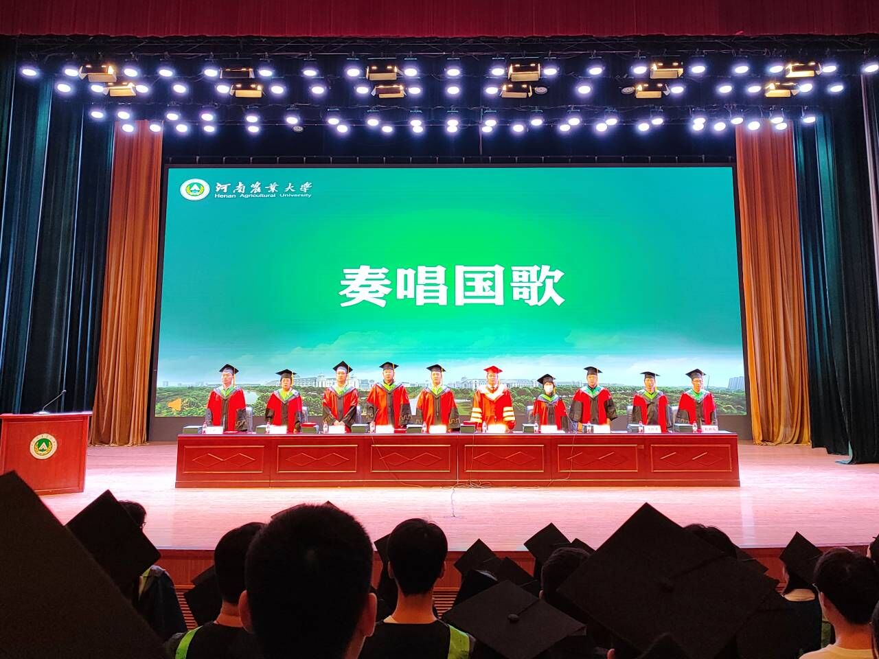 毕业典礼在雄壮嘹亮的国歌声中拉开帷幕。