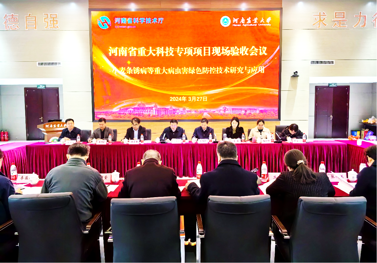 李洪连教授主持的河南省重大公益性科研专项“小麦条锈病等重大病虫害绿色防控技术研究与应用”进行了验收。省科技厅现代农业农村处处长李锦辉及厅有关部门负责人,校党委副书记何松林,银河娱乐场