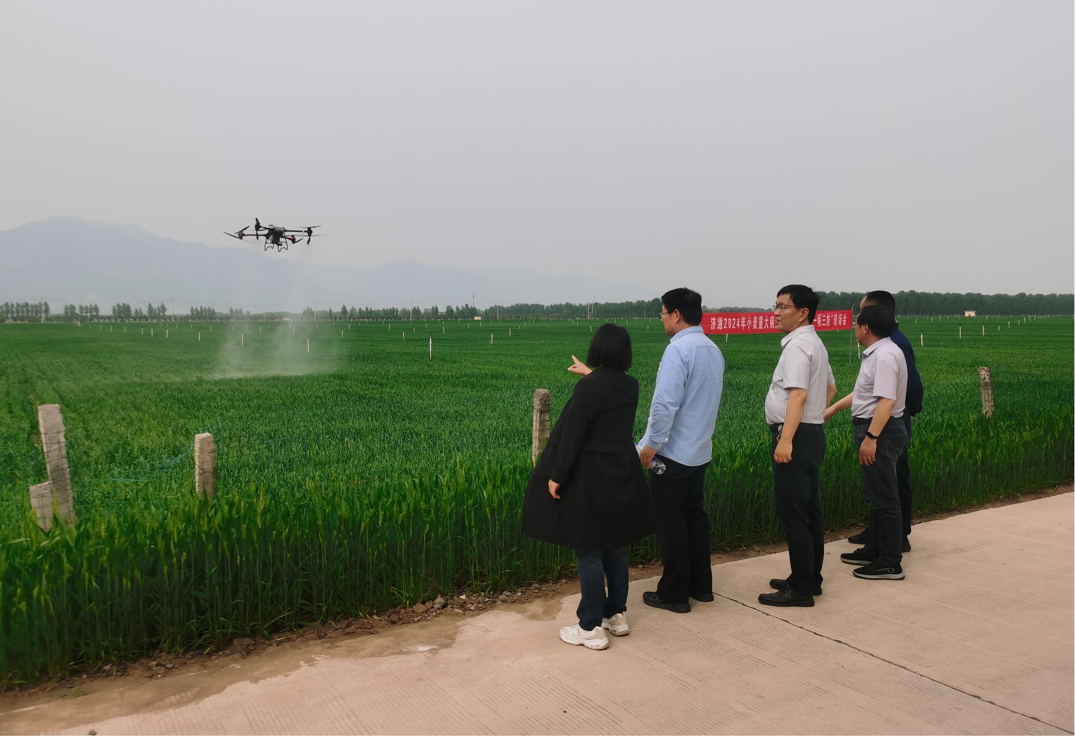 在五龙口镇留村小麦统防统治现场,专家组观看了植保无人机飞防作业,与种植大户及飞防人员进行了认真交流,对喷药时间与选用的药品配方提出了建议。