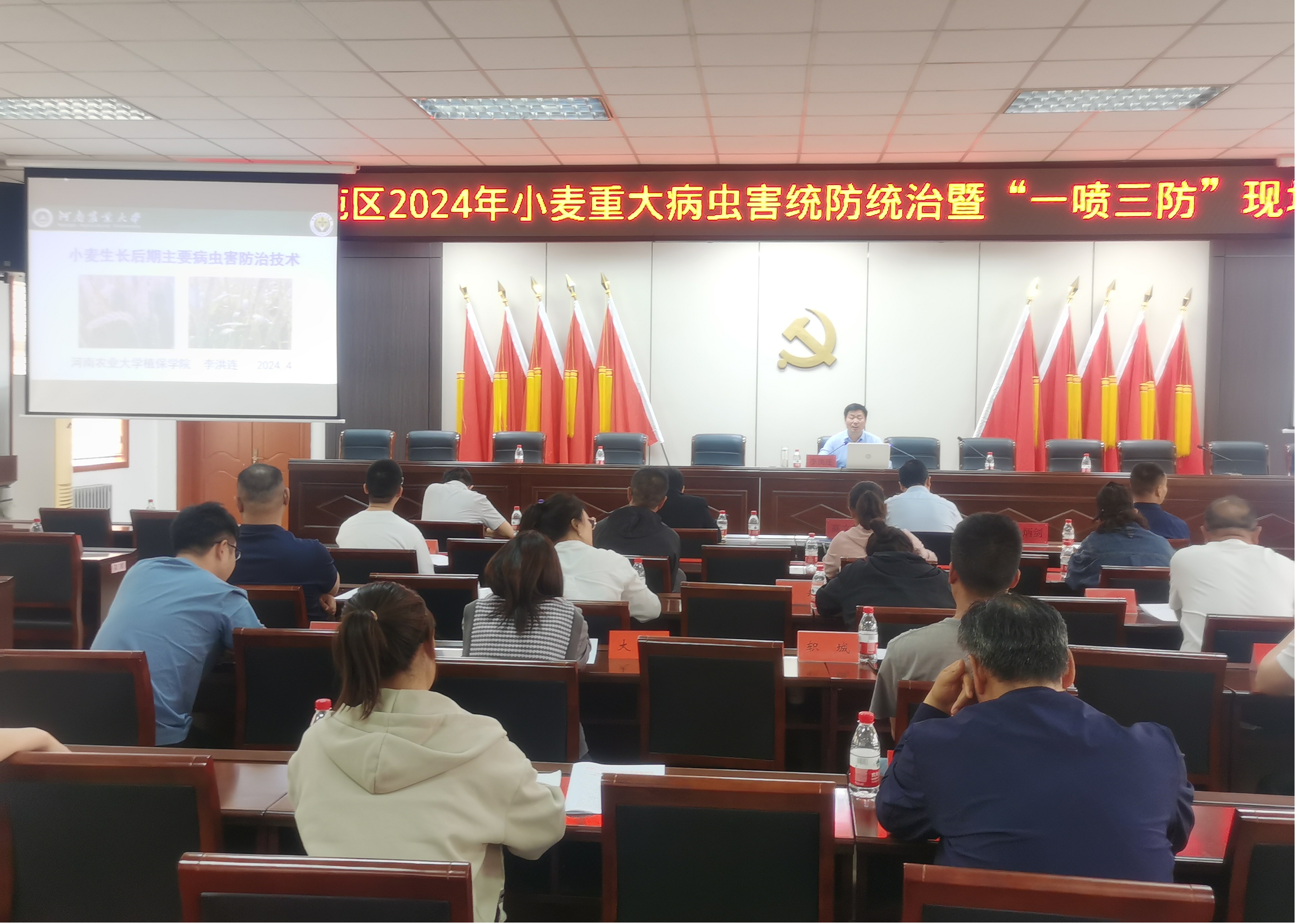 李洪连为参加会议的80多名基层农技人员、镇(街道)农业工作人员做了小麦后期病虫害防治技术培训,嘱托大家担当重任,抓住关键时期,迅速掀起防控高潮,指导开展统防统治和群防群治,做到应防尽防,打好赤霉病等重大病虫害防控攻坚战,为保障小麦丰产丰收打下坚实基础。