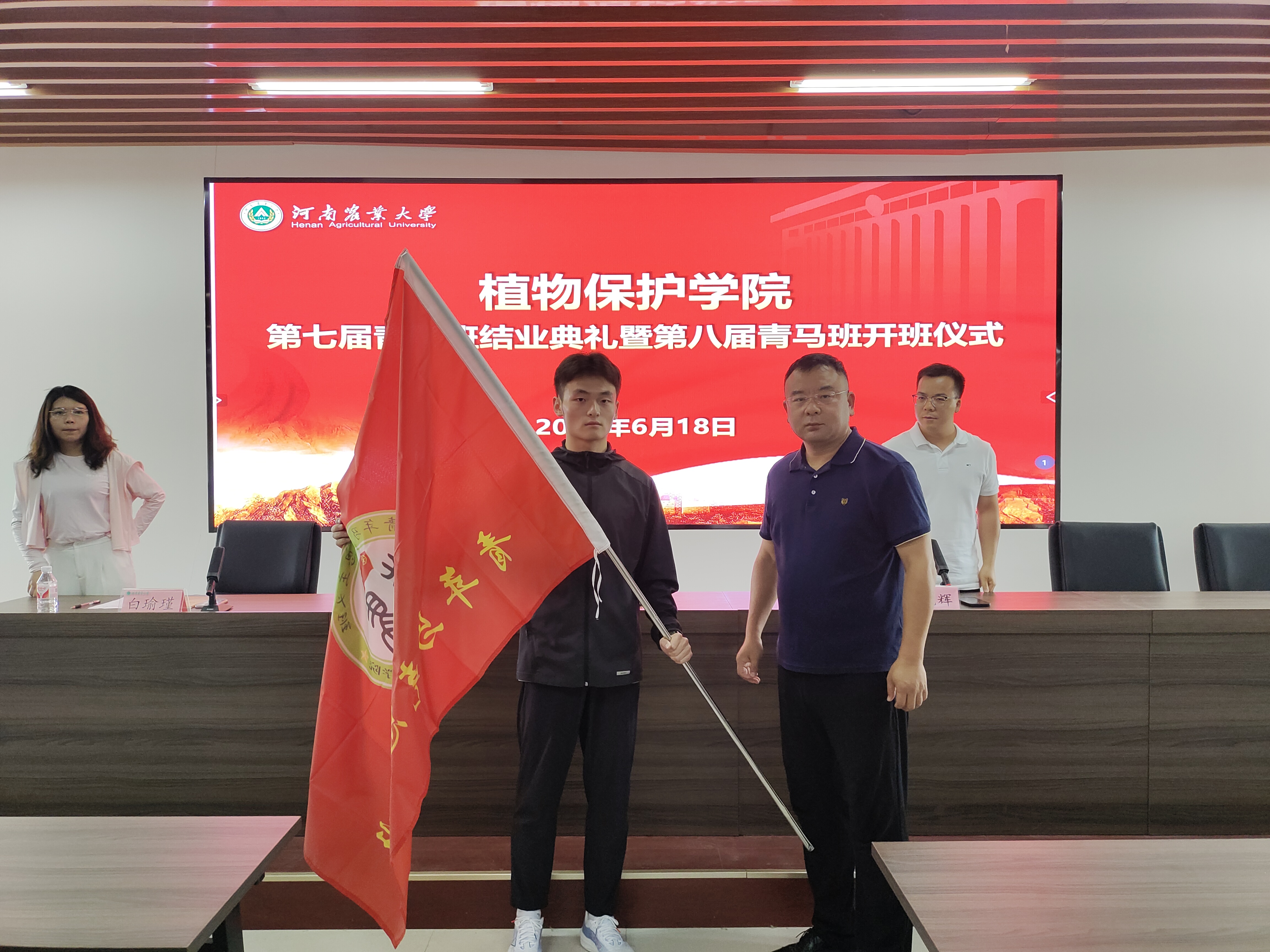 鲁兴为第八届青马班学生代表柴川智授旗,并对青马班的成功换届表示祝贺。