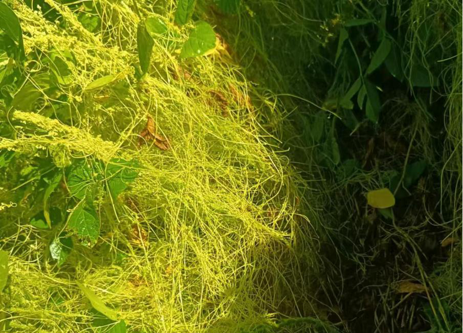 在农户的陪同下,林榕梅、张晋玉等人来到冯庄镇的 200 余亩大豆田,他们发现大豆田中菟丝子问题较为严重,针对此症状,提出有效的防治措施:一是及时发现并清除寄生在大豆根部和茎部的菟丝子植株;二是使用仲丁灵(地乐胺)这一常用除草剂,于大豆始花期(或菟丝子转株危害时)进行茎叶喷雾处理。使用时需注意喷雾均匀,确保菟丝子缠绕的茎都能接触到药液,以达最佳防除效果。在大豆田中的菟丝子开始转株危害时,使用 48%仲丁灵乳油 100 - 200 倍液均匀喷雾于寄生在植株上的菟丝子。预计使用仲丁灵进行土壤封闭处理,对菟丝子的防效能达到 90%以上。