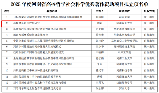 高级会计师曲岩副院长申报的“高校财务内部控制研究”获得2025年河南省高校哲学社会科学优秀著作资助项目立项。