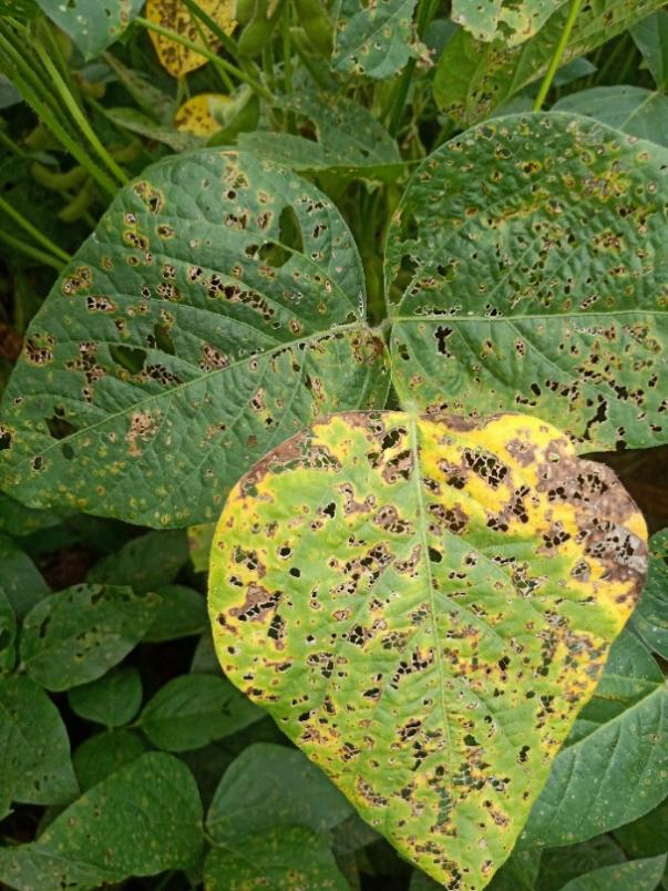 在获嘉县利生农业服务专业合作社负责人的陪同下,服务队来到获嘉县冯庄镇的百余亩大豆田中查看大豆长势。发现部分大豆叶片有细菌性斑点病,这是由丁香假单胞菌大豆致病变种引起的一种细菌性病害,主要危害大豆的幼苗、叶片、叶柄、茎和豆荚。科技特派员建议农户通过农业防治、生物防治和化学防治三个方面来防治: