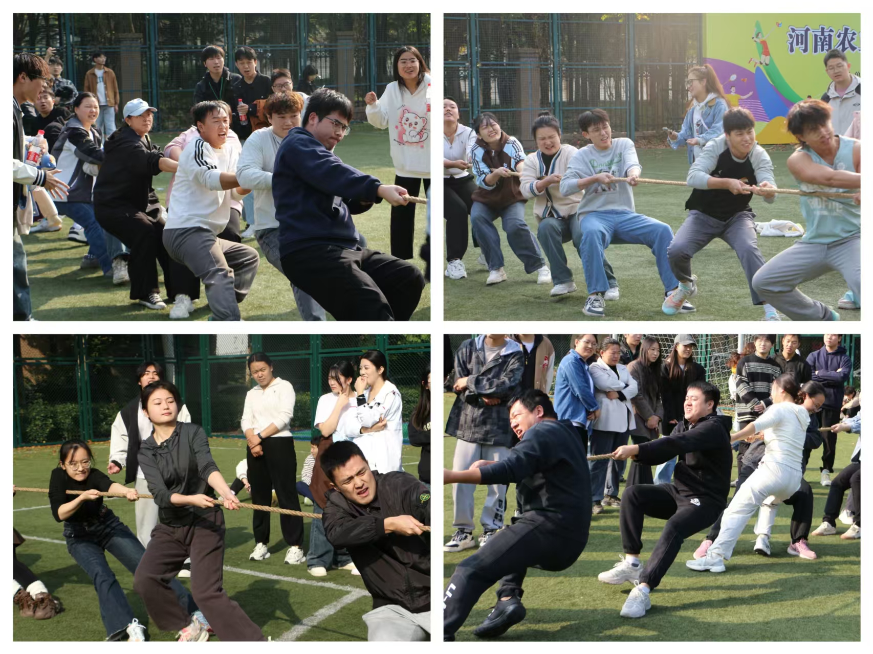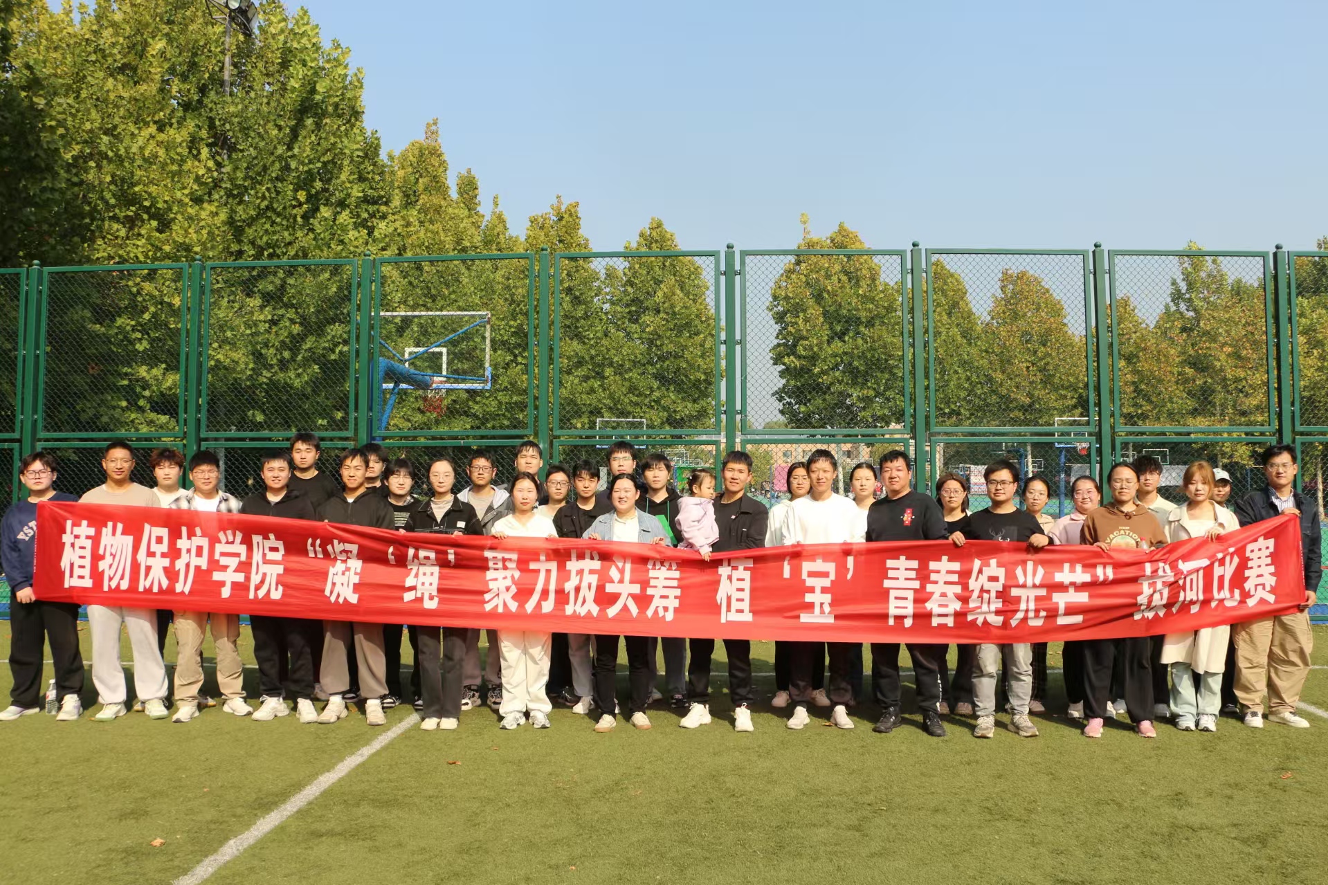 于龙子湖校区足球场举办以“凝‘绳’聚力拔头筹 植‘宝’青春绽光芒”为主题的拔河比赛。22级本科、23级本科及研究生共31支参赛队伍参加比赛。