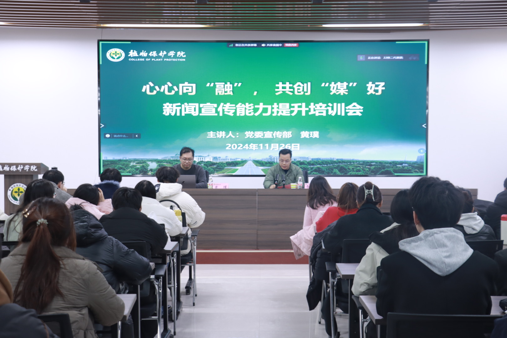 于龙子湖校区第二实验楼六楼会议室开展新闻宣传能力提升培训会。会议邀请校党委宣传部黄璞老师作专题培训,院团委老师及全体学生干部参加会议,会议由新媒体指导老师李晓辉主持。
