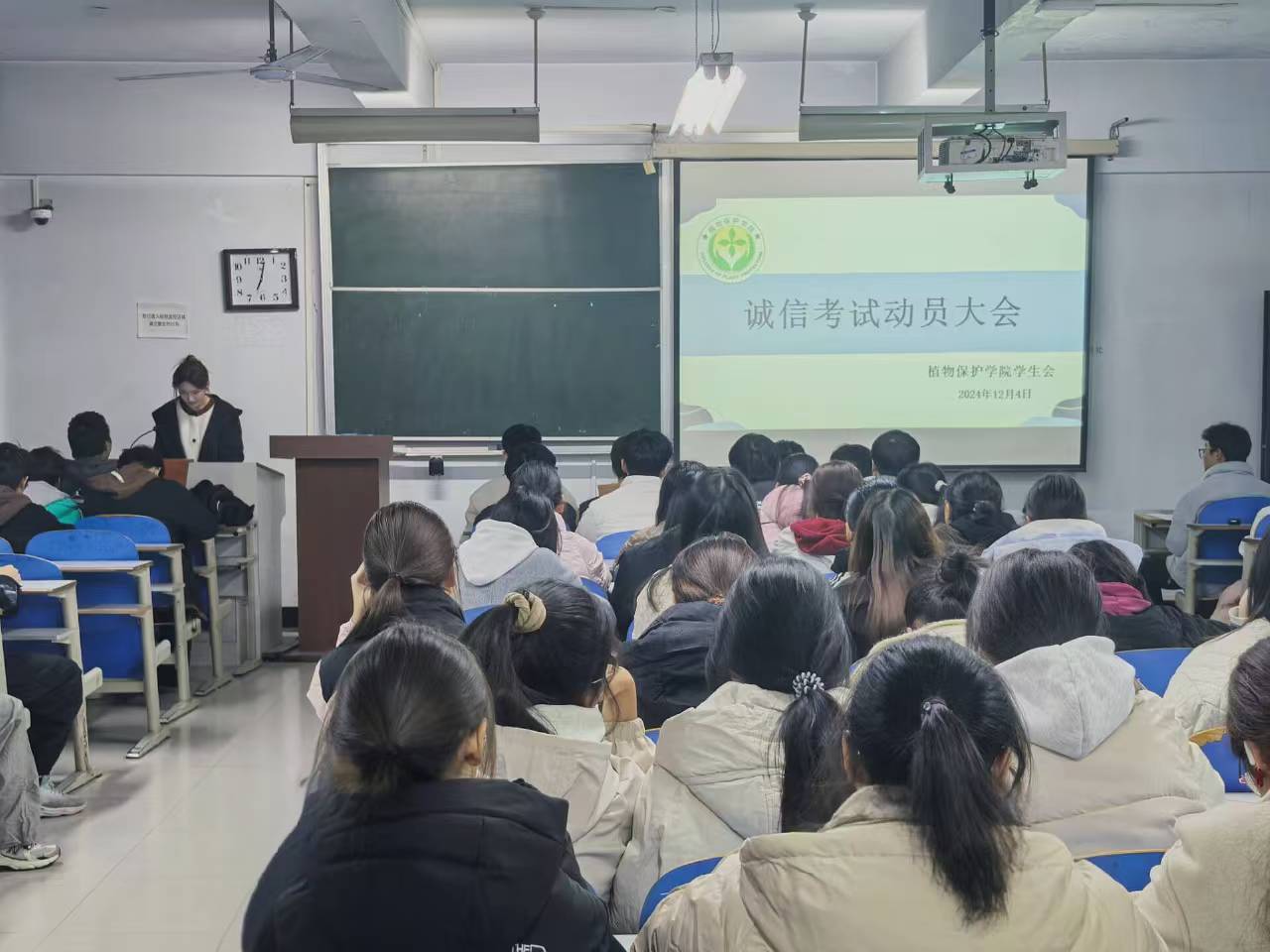于桃李园桃西楼603、604教室召开2024-2025学年第一学期诚信考试动员大会。24级辅导员郭俊阳及24级全体学生参加本次大会,会议由学实部王子越、王思语主持。