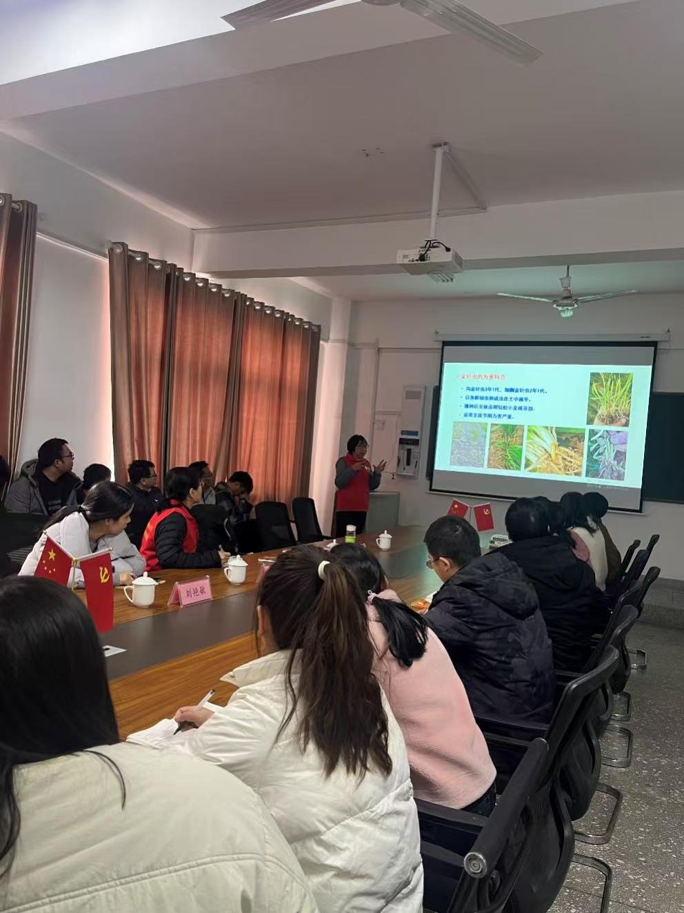 实地考察结束后,服务队来到济源市奥邦生物科技有限公司。公司负责人详细介绍了公司发展现状、产业优势及未来规划,郭线茹针对小麦越冬期和来年田间管理,向公司员工做了“小麦主要害虫识别与防治”的报告,详细介绍了麦田害虫种类、形态特征、为害症状、药效试验应注意的问题等。郭线茹还将自己主编的《玉米病虫草害诊断与防治原色图谱》、《烟草昆虫学》及珍藏的多本农业害虫防治书籍赠与奥邦公司,助力企业技术储备再上新台阶。报告结束后,双方围绕药效田间试验中发现的问题及今后合作事宜进行了商讨。