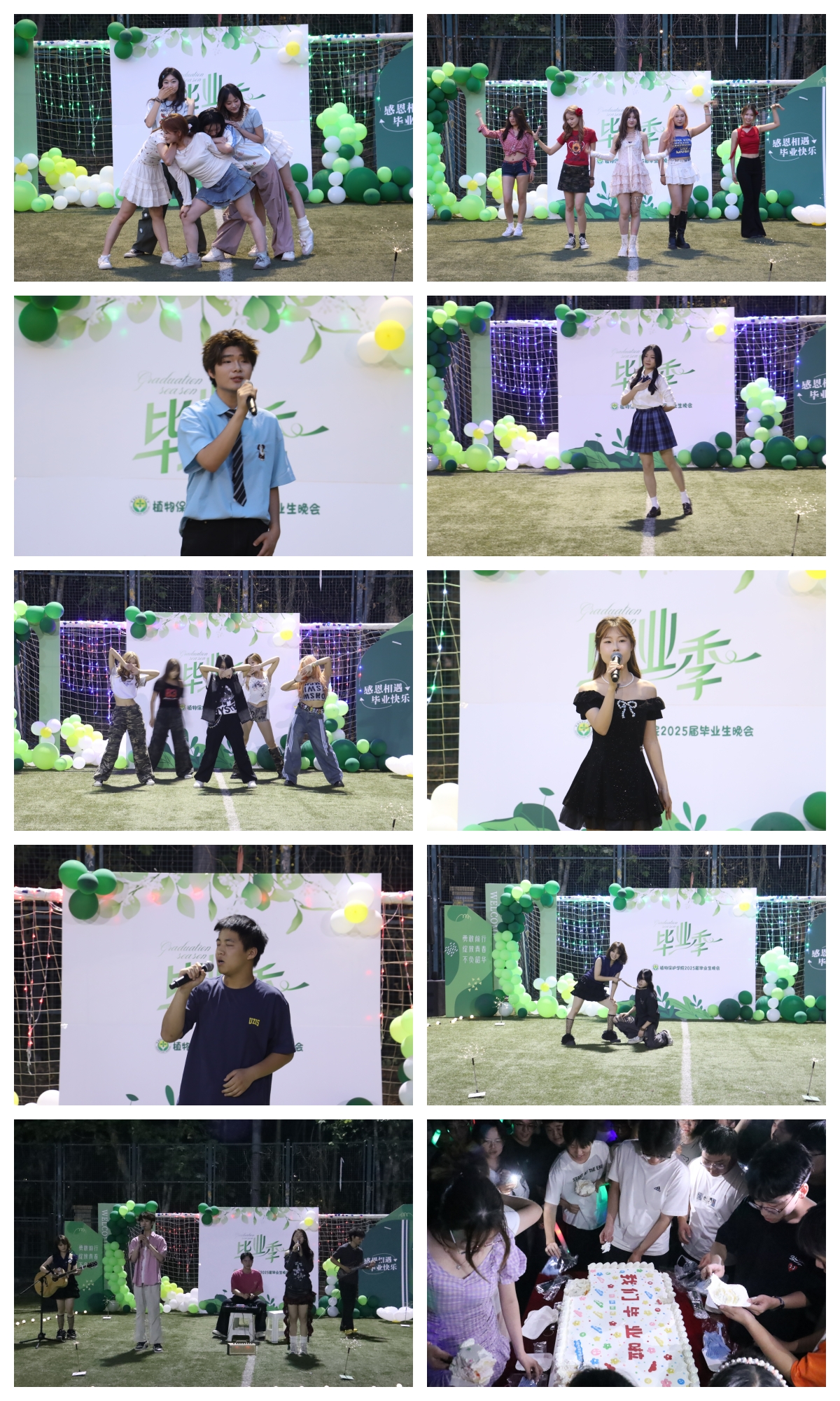 以艺载道诉别情。当《Bite Me》与《咆哮》的接连登场,荧光棒的海洋随节奏翻涌,将晚会推向首个高潮。《红色高跟鞋》的慵懒爵士与《红豆》的经典重现形成绝妙呼应,为狂欢之夜注入细腻情感。压轴舞蹈《Replay》再次炸裂全场。在终曲《半句再见》的旋律中,同学们自发打开手机闪光灯,足球场化作一片星海。晚会尾声,银河娱乐场 为2025届毕业生定制的毕业蛋糕缓缓推出,甜蜜的分享仪式中,镜头定格下一张张盈满笑意的脸庞。