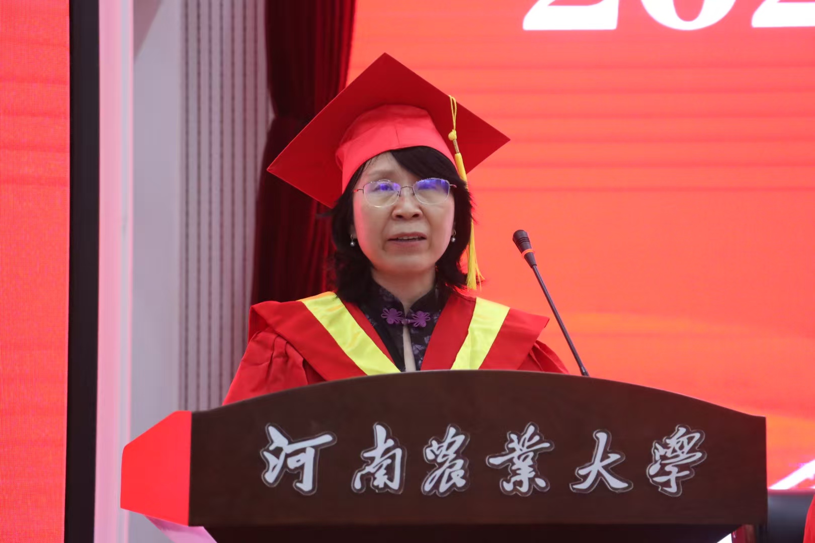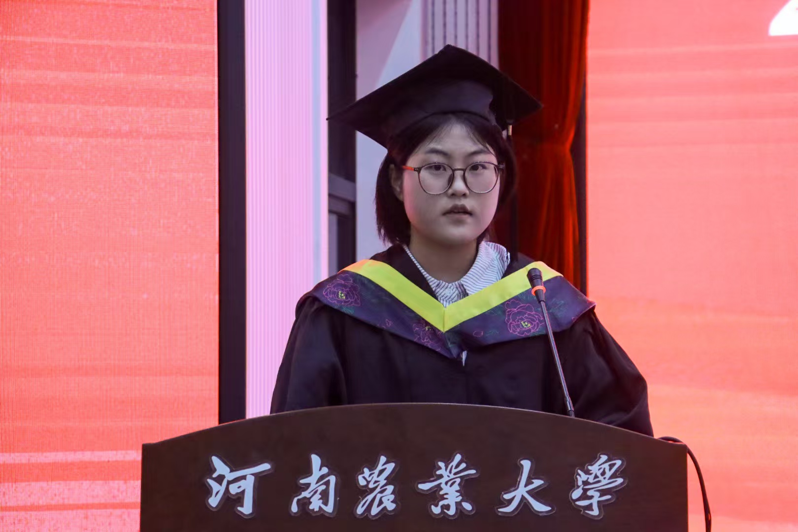 2021级制药工程专业四班刘恋作为本科生代表上台发言,她讲述了自己与农大的故事,并向悉心栽培、倾付关怀的师长致以最深切的感恩,向并肩奋斗、携手同行的同窗献上最美好的祝愿,立志以青春为笔、以实干为墨,在新时代的广阔天地中勇做攻坚克难、开拓创新的“追梦奋斗者”,于祖国发展浪潮中书写使命担当,为民族复兴伟业贡献磅礴力量。