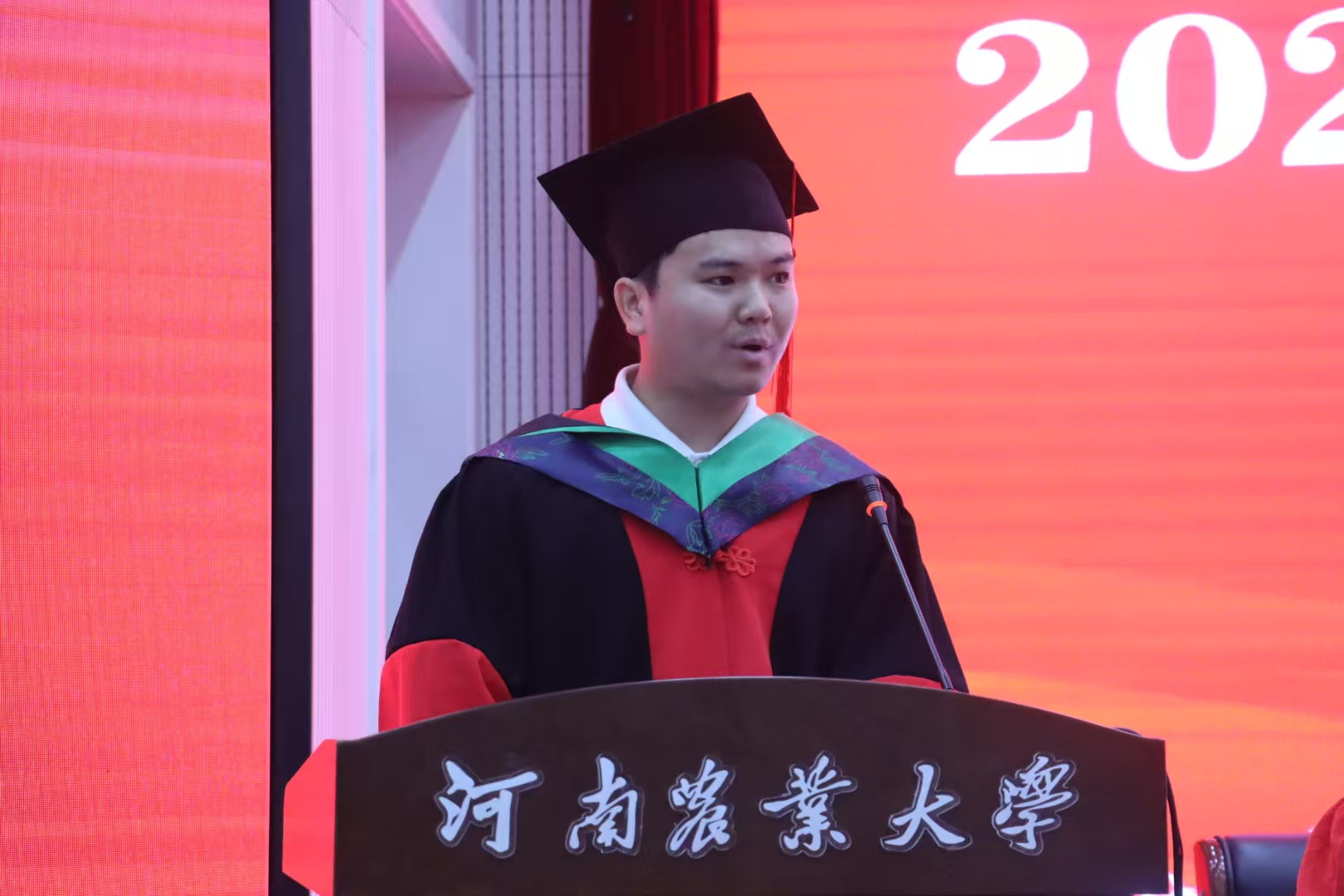 2021级博士生孙龙龙代表2025届全体毕业研究生发言,他用真挚的感情感激农大的关怀和爱护,他表示唯有保持“初生牛犊不怕虎”的锐气,鼓起“扶摇直上九万里”的劲头,终能积小胜为大胜、积跬步至干里,向母校和毕业生们表达了深深的祝福,愿银河娱乐场