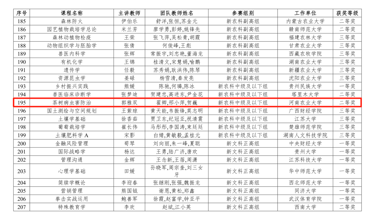 郭雅双老师带领的《茶树病虫害防治》课程团队凭借扎实的教学功底、丰硕的教学成果和创新的教学理念,在比赛中脱颖而出,荣获新农科中级组二等奖,实现河南省在全国教创赛新农科赛道的历史性突破。