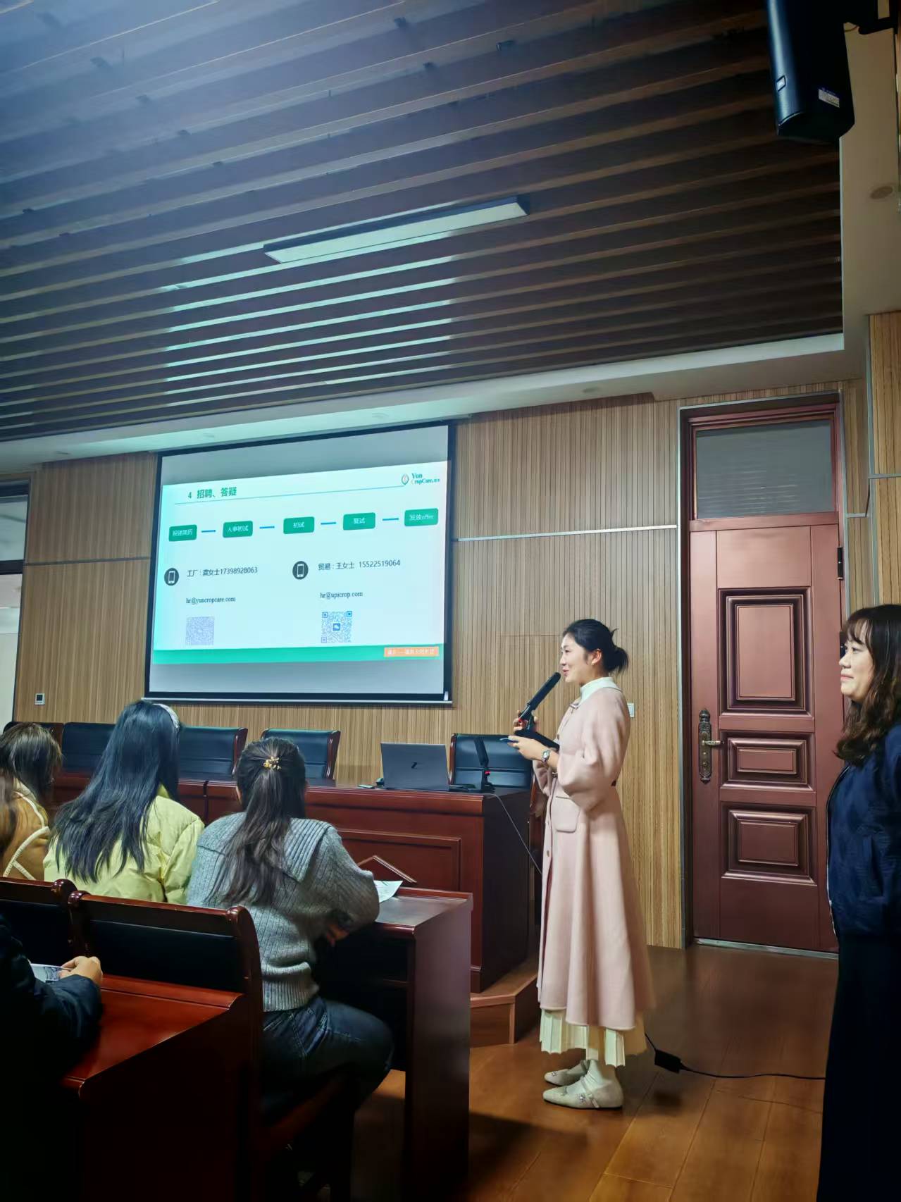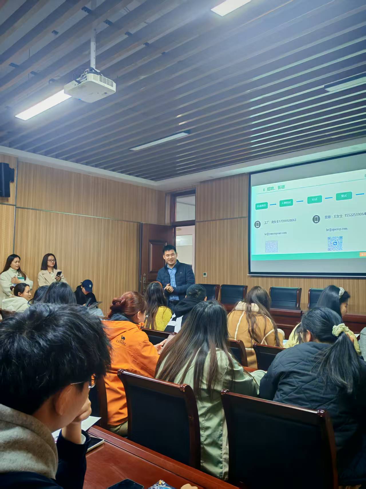分享环节,吴静结合自身职业成长经历,分享了植保行业的发展趋势与企业社会责任。他表示,农业现代化背景下,植保领域对“懂技术、能实践、善创新”的专业人才需求迫切,并详细介绍了企业的人才培养体系:构建“双成长”通道,配套轮岗实训、研发奖励基金等支持政策;现场同步发布外贸管培生、国内农药登记等岗位招聘计划,明确了岗位要求、薪资福利及求职面试流程,为学生提供了清晰的就业对接指引。