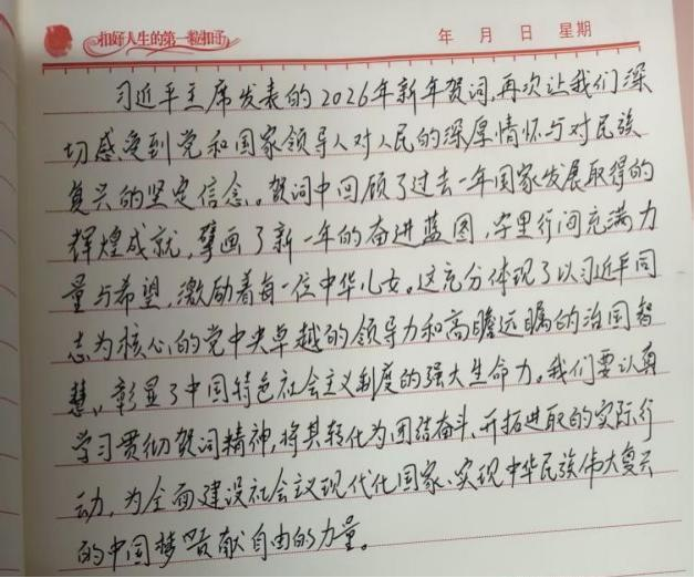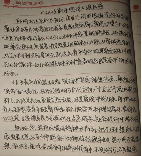 直播时,所有青马班学员聚精会神聆听贺词,时而为“十四五”收官之年的辉煌成就由衷赞叹,时而为“十五五”开局的宏伟蓝图倍感振奋。学员们认真记录下贺词中的金句要点,在笔记本上写下一行行感悟。同时又深受总书记寄语鼓舞,决心将个人理想融入国家事业,践行“请党放心,强国有我”誓言,在新时代书写青春华章。