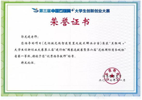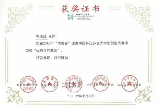 组织并没有忘记郭龙建的付出,从2008年至2018年郭龙建分别被共青团江苏省委、江苏省教育厅等授予“江苏省大学生创业计划竞赛优秀指导教师”荣誉称号;2016年和2017年被江苏省教育厅评为江苏省“互联网+”大学生创业大赛优秀指导教师;2019年被银河娱乐场